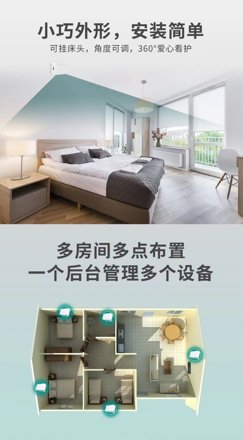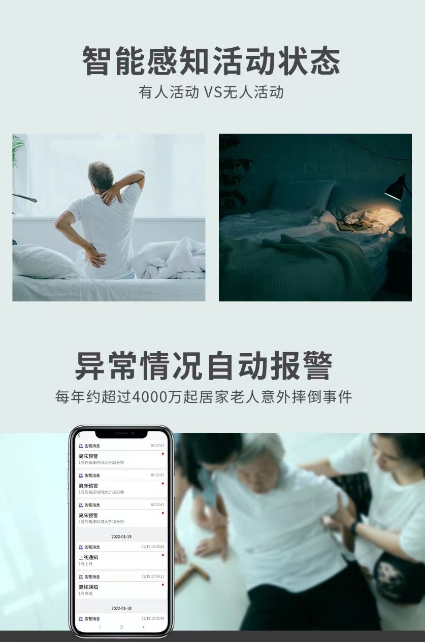 The millimeter wave intelligent sleep recorder is a non-invasive intelligent vital sign monitoring product that can achieve millimeter level detection of peristalsis in the chest and abdomen of the human body. It can monitor breathing, heartbeat, and limb movements of people lying (or sitting). Specifically, it can sense vital sign data of a person lying or sitting in bed, such as position, current state, heart rate, respiratory rate, respiratory waveform, body motion index, etc. This product has the advantages of low cost, 24/7, insensitivity, refined human body state measurement, safety, convenience, high sensitivity, stable performance, strong anti-interference ability, privacy protection, etc.