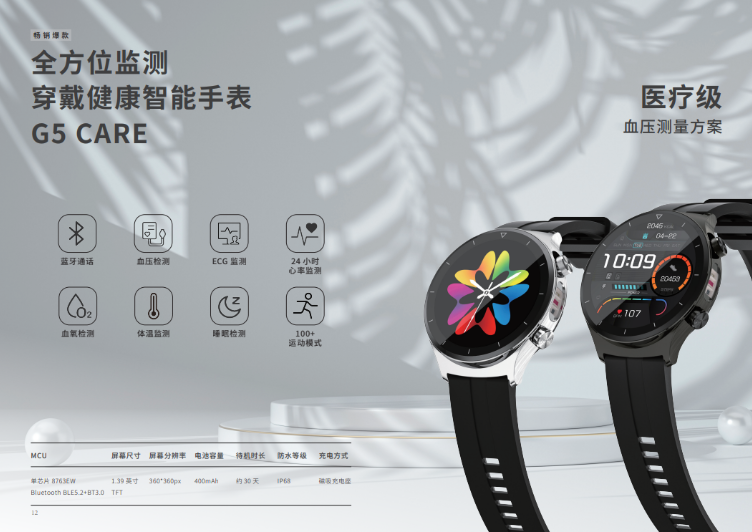 G5 Care all-round sign monitoring wearable health smart watch, support blood pressure blood oxygen synchronous monitoring, ECG electrocardiogram detection, real-time accurate body temperature, 24-hour heart rate tracking, multi-sport mode, sleep quality detection and other functions. Among them, blood pressure can be accurately and quickly measured, easy to manage blood pressure health, equipped with high-precision sensors and national patented VitaHema detection technology algorithm, through photoplethysmography pulse technology (PPG), real-time and convenient detection of blood pressure changes throughout the day.
