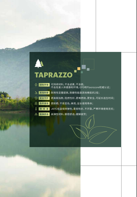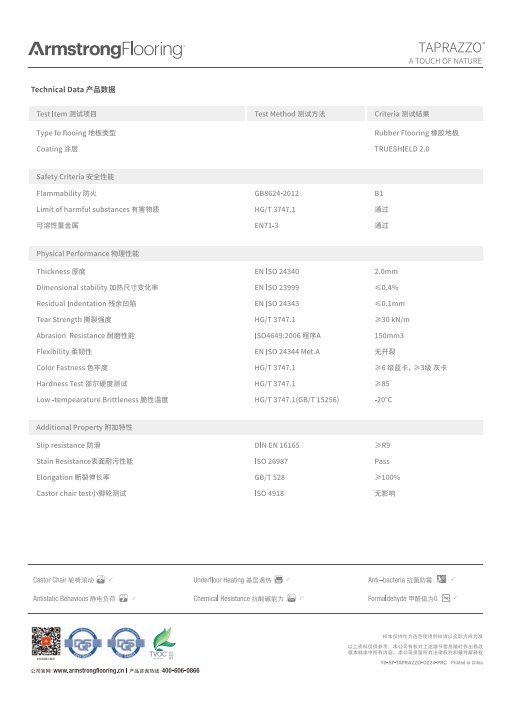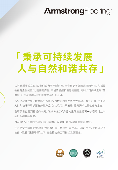 Since its establishment, Armstrong has been dedicated to continuously innovate and striving for a better future. This includes providing more inspiring designs, durable products, strict quality control, and excellent service. Moreover, the concept of "sustainable development" has been deeply integrated into our mission and corporate governance. In today's global context, where society and the environment face significant challenges such as ecological degradation and frequent climate issues, Armstrong is committed to protecting the environment and delivering products that benefit both humans and the planet, fulfilling our mission and commitment to sustainable development. In today's era, where environmental protection is increasingly prioritized, the launch of the "TAPRAZZO" product line will once again lead industry innovation and upgrades. All "TAPRAZZO" products are made from environmentally friendly raw materials, adhering to the core concepts of health, environmental protection, and durability. Throughout the product lifecycle, from R&D to production, usage, and recycling, we emphasize "health and environmental protection," fully aligning with the principles of green and sustainable development.