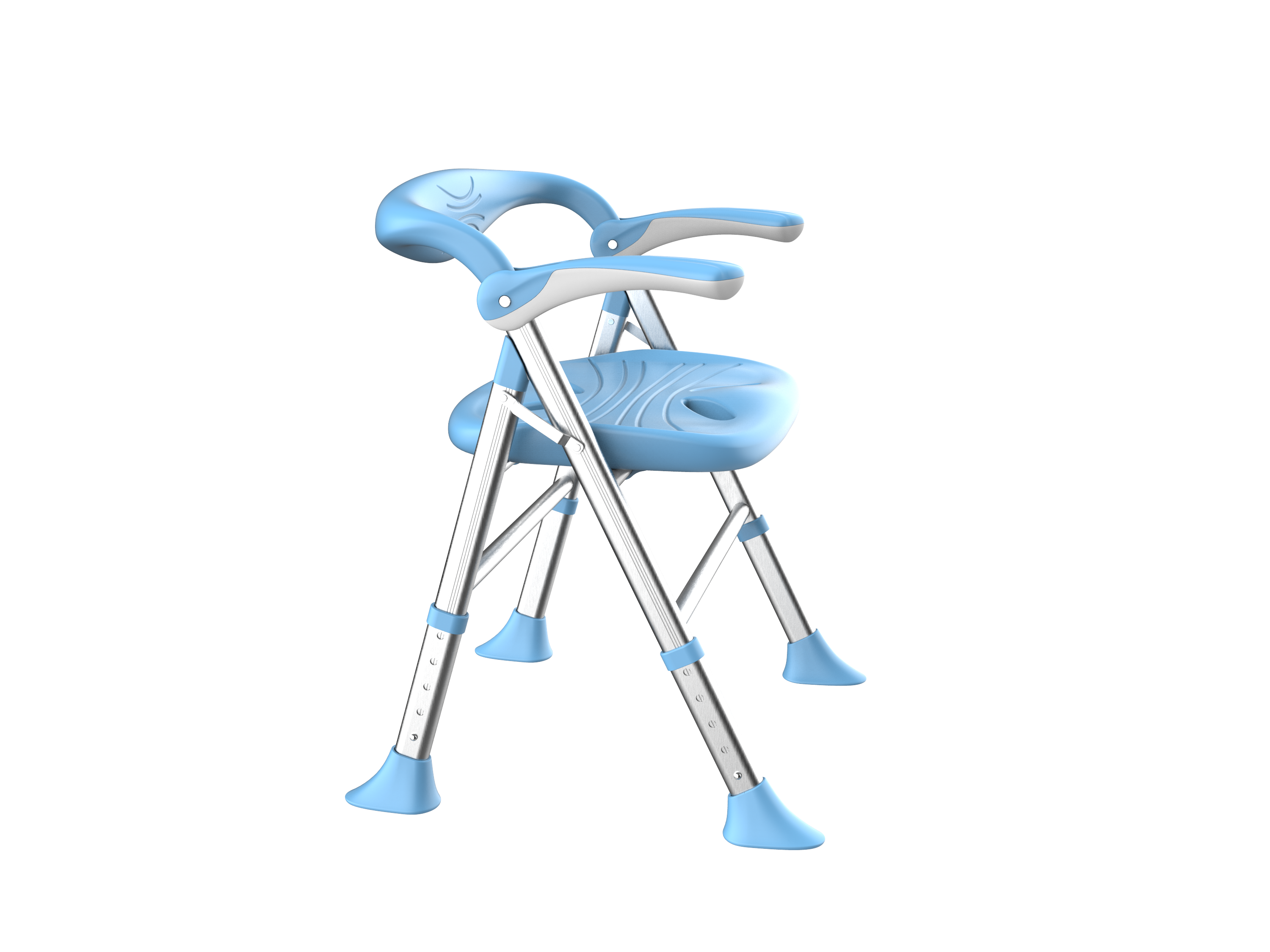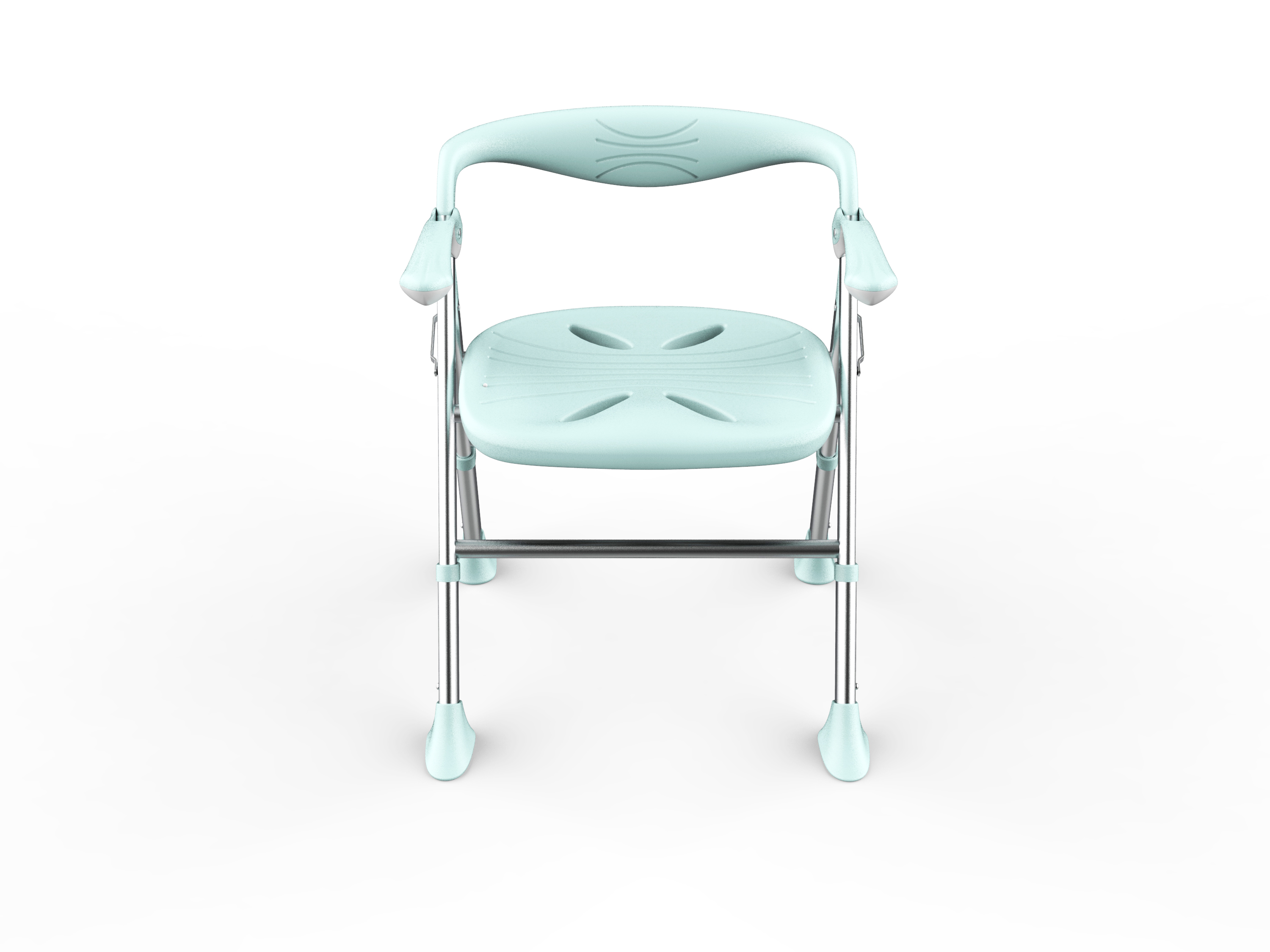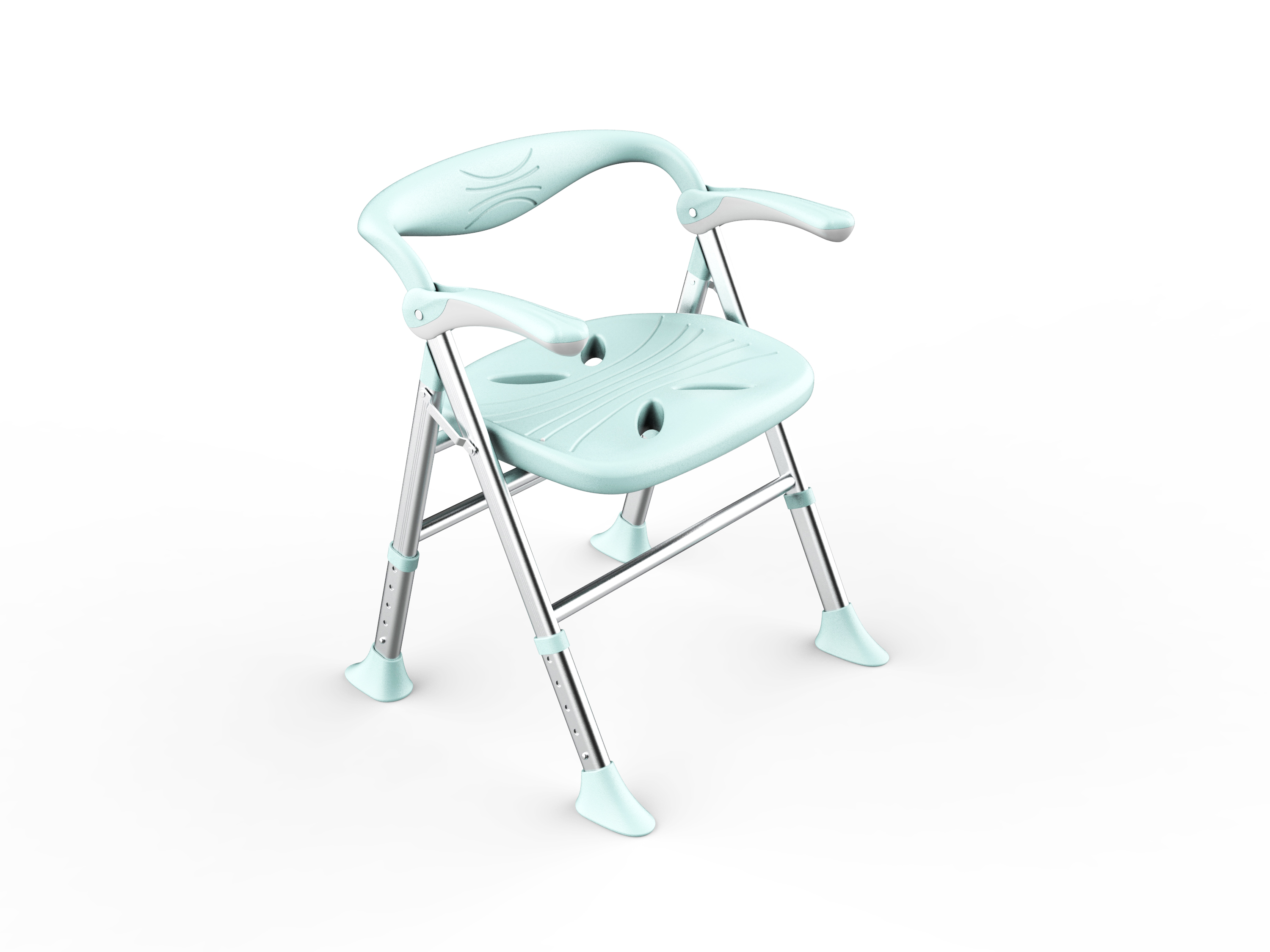 1. Foldable 2. The armrest can be flipped up 3. Sitting board with water channel and leakage hole 4. Height adjustable in 5 levels 5. With backrest 6. Low backrest design, more suitable for shower use 7. The width of the front and rear brackets can be widened according to the height of the chair, making the chair support more stable