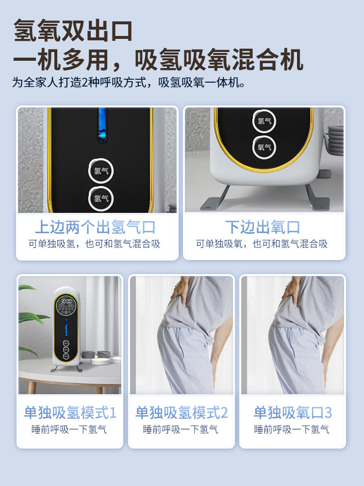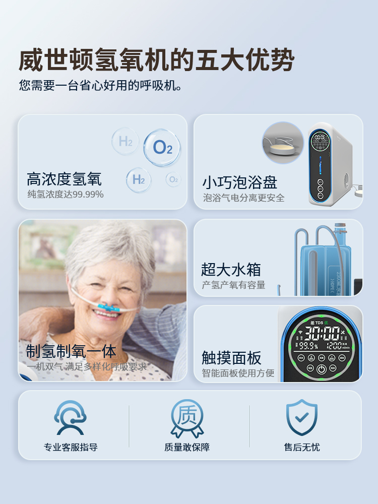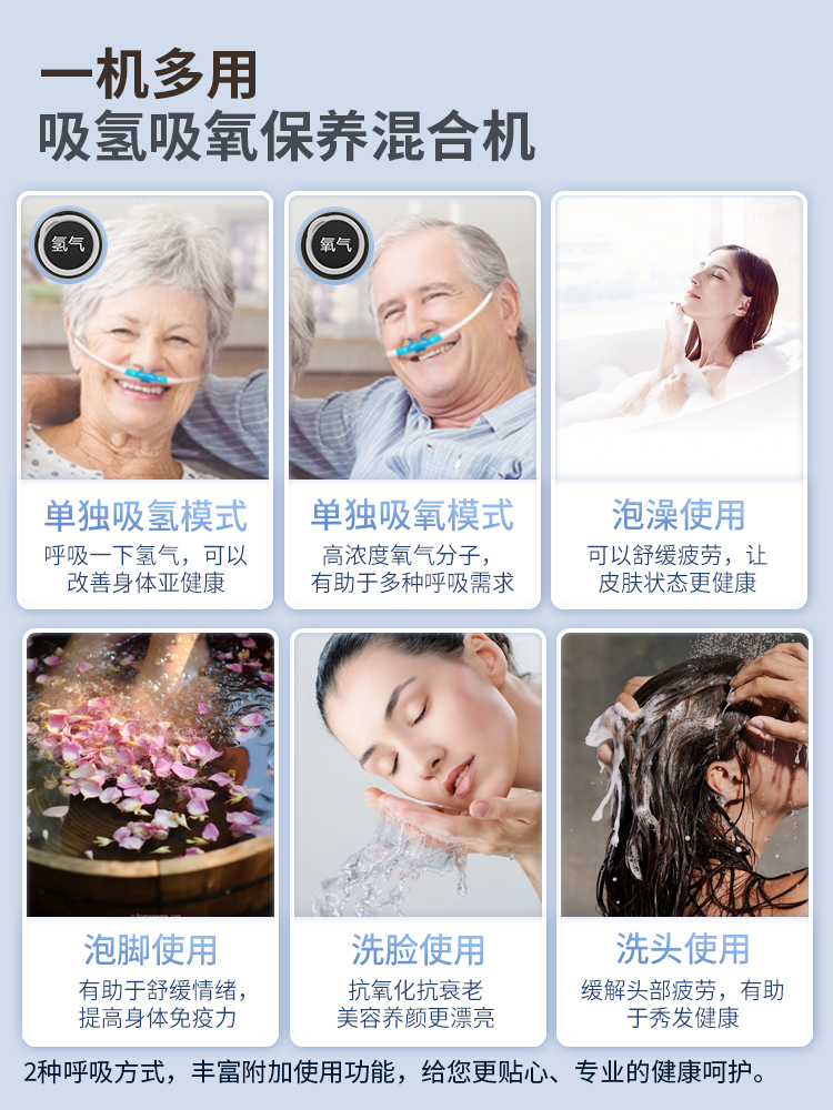 1. 99.99% high hydrogen concentration, enjoy pure gas. 2. Gas production rate: VST-XH5-1350: gas production rate 1350ml/min. 3. Gas production rate: VST-XH5-1800: gas production rate 1800ml/min. 4. Hydrogen and oxygen outlets are separately designed, can inhale hydrogen/can inhale oxygen/can inhale both hydrogen and oxygen. 5. The product screen uses a marquee design, standby screen off to save power and be quieter. 6. It uses a PEM pure water electrolysis cell and a dedicated SPE ion membrane from American Vishilton, with precious metal iridium oxide. 7. Five major alarm prompts: high temperature protection/water tank water shortage/TDS monitoring/maintenance reminder. 8. Multi-purpose machine, can be used for inhaling hydrogen, inhaling oxygen, bathing, soaking feet, washing face, and washing hair.