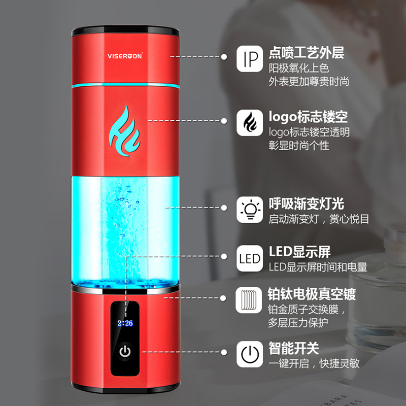 1. Dedicated SPE ion membrane from American Vishilton, precious metal iridium oxide, for more thorough hydrogen-oxygen separation. 2. Hydrogen production content: 2500-3000ppb (after 5 minutes), 4000-5000ppb (after 10 minutes). 3. SPE technology combined with a pressure-resistant cup bottom allows for more thorough hydrogen dissolution under high pressure. 4. Compatible with mineral water bottles. 5. Six layers of platinum plating, three layers of platinum sheets, with a high-end frosted texture. 6. Sealed and leak-proof, no leakage even when shaken. 7. Comes with a high-end gift box, an excellent choice for gifting.