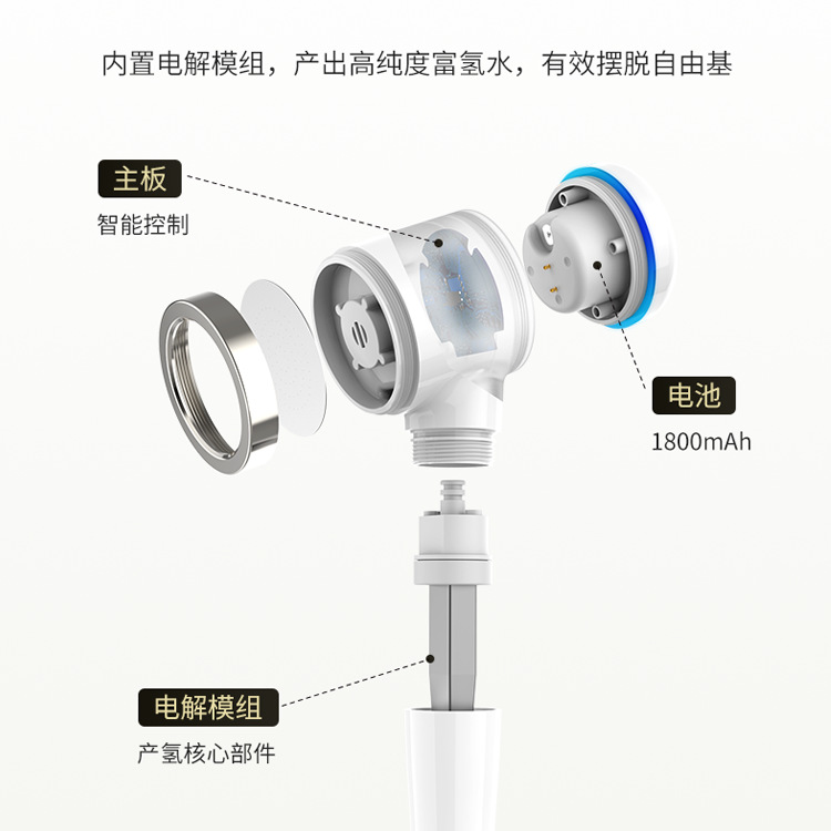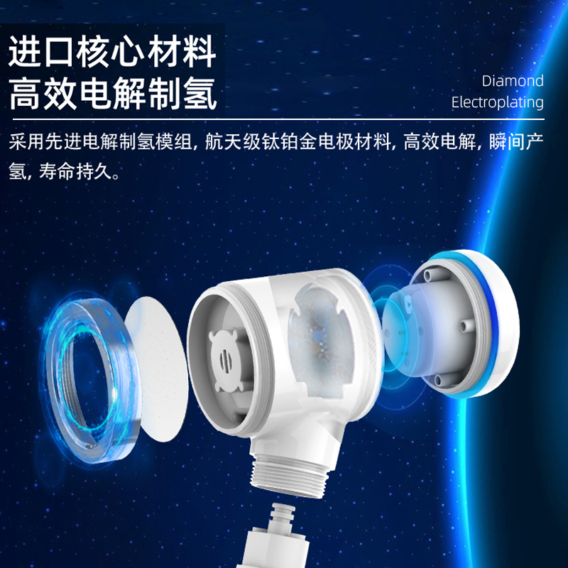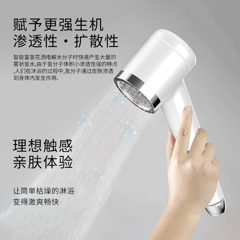 1. Electrolyze hydrogen rich water to care for every inch of the skin 2. Electrolyzing water produces trace amounts of hypochlorous acid, which has a bactericidal effect on the skin 3.0.3mm microporous water outlet design, smooth skin 4. Internal pressurization structure design to maintain water outlet pressure 5. JSIPX7 waterproof rating, safer and more reliable to use 6. Automatically sensing water flow to start working, automatically stopping working when water is cut off