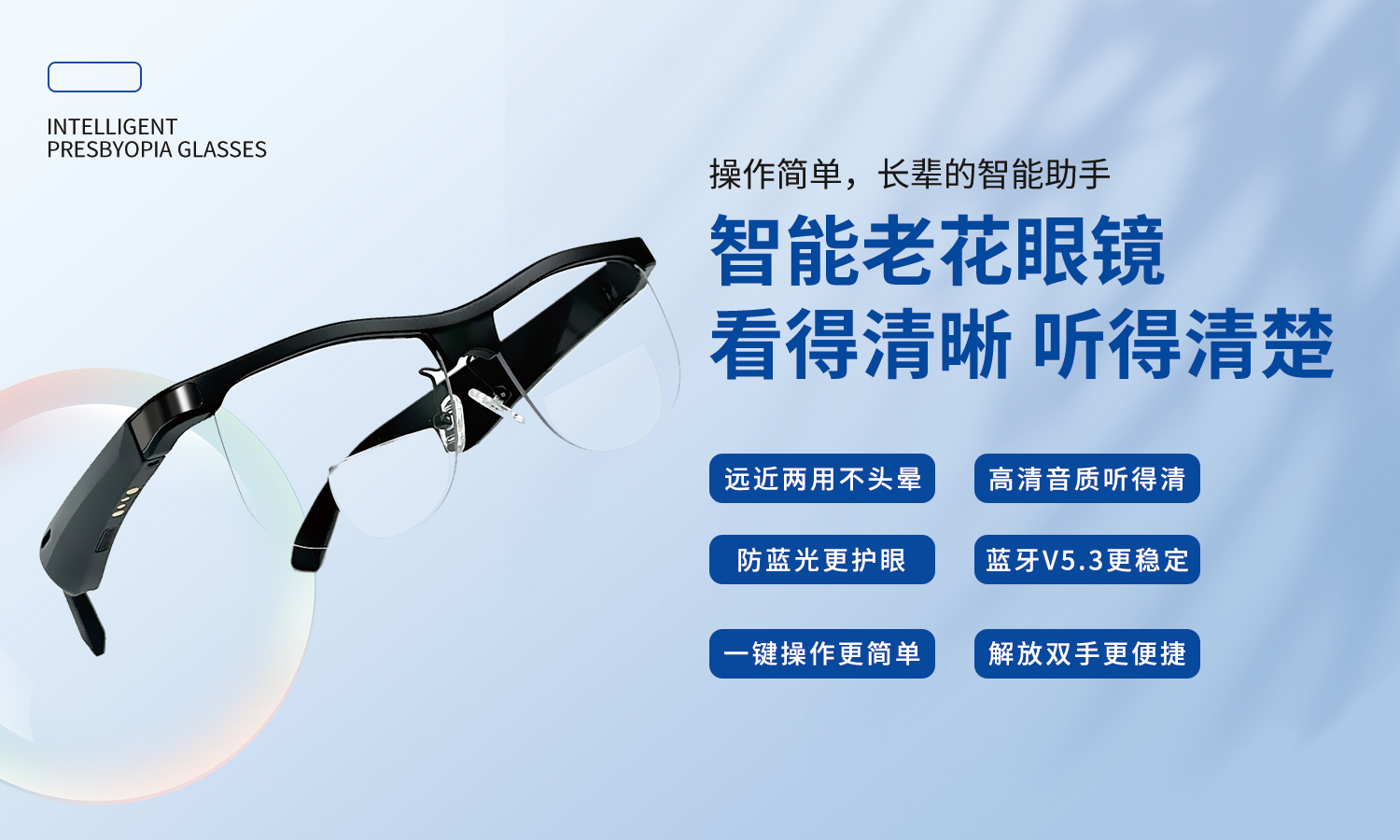 Intelligent presbyopia glasses are designed for the presbyopia population. It includes glasses function, Bluetooth earphones, Bluetooth microphone, and AI module function. Dual lens lenses can see far and near without dizziness, and the lenses prevent blue light, protecting eye health; The frame adopts a comfortable wearing design, suitable for long-term use, while enjoying music videos without disturbing family members. The open listening experience allows the elderly to see clearly and maintain connection with the outside world, making it more reassuring to go out.
