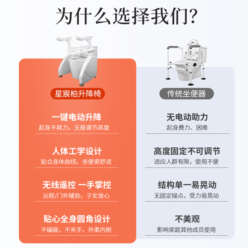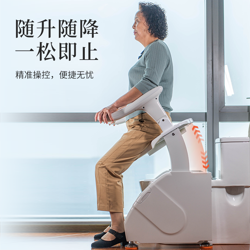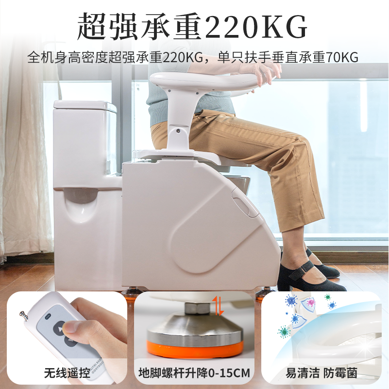 The toilet lift chair is an toileting aid for people with mobility impairments. It features electric one-button lifting, operating stably and quietly, with adjustable height to meet different needs. Adopting an ergonomic design, it is equipped with non-slip armrests and footrests, supporting a load of 200kg, and has safety protections like anti-leakage. Easy to install without bathroom renovation, its waterproof material can be cleaned with a wipe. Suitable for the elderly, post-operative patients and the disabled, it helps them use the toilet independently and reduces fall risks