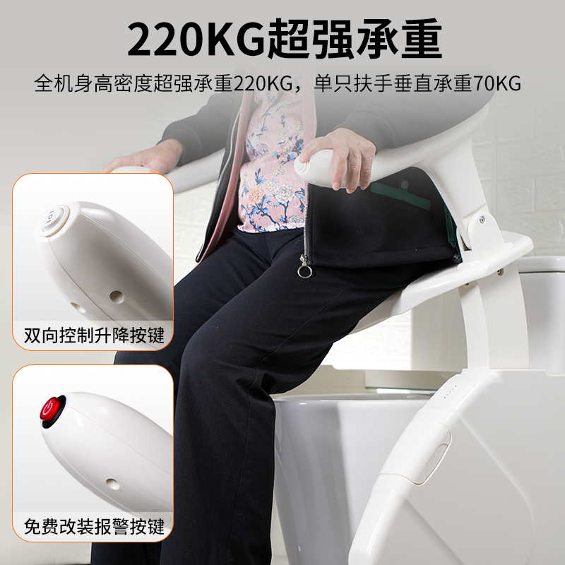 The intelligent toilet lift chair combines lifting assistance and smart cleaning functions, specially designed for people with mobility impairments. It features electric one-button lifting, adjustable armrests, stable and quiet operation, and a load-bearing capacity of up to 200kg. Equipped with Washlet functions such as warm water washing, warm air drying and intelligent deodorization, it eliminates the need for manual wiping. With anti-slip design and one-button emergency call, it is 360° waterproof for easy cleaning and can be installed without bathroom renovation. Suitable for the elderly, post-operative patients, etc., it safeguards safety and dignity during toileting.