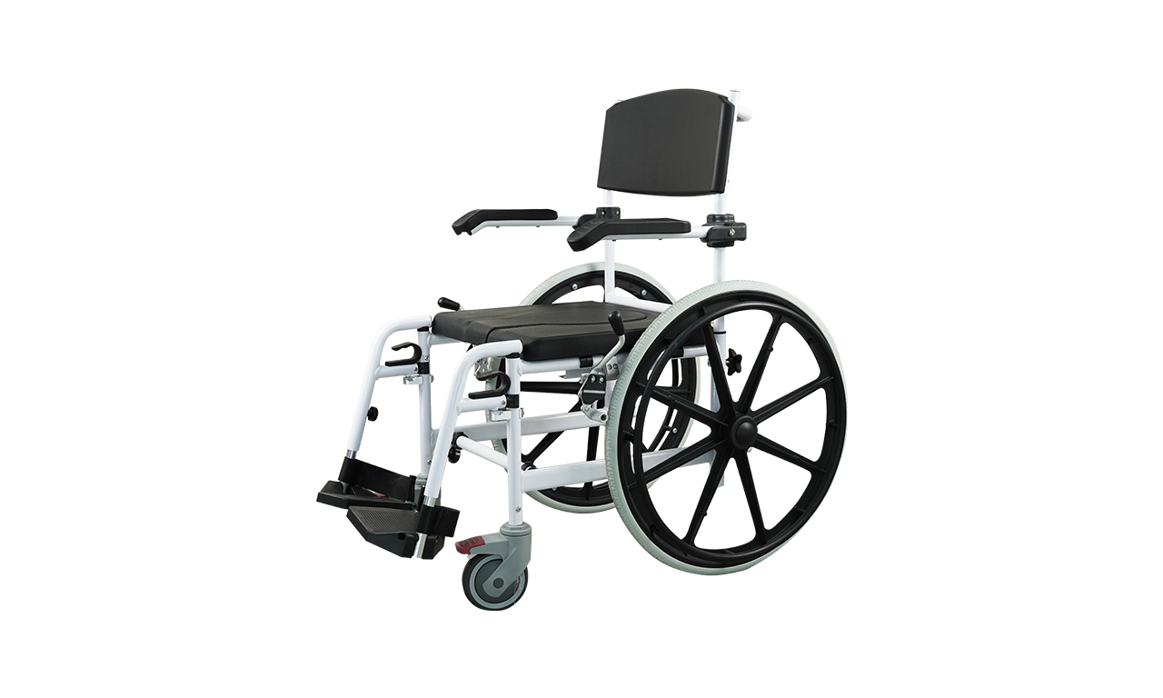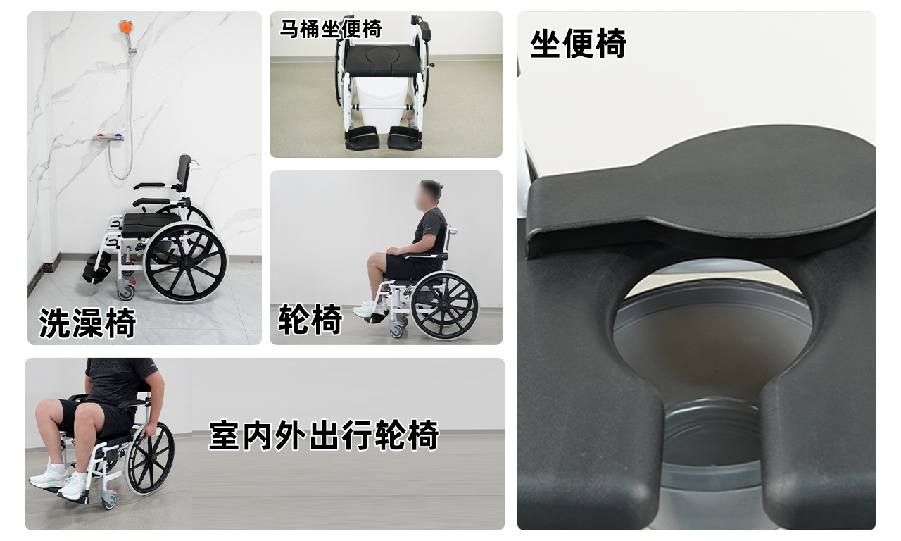 1. Three-in-one toilet, bath and stroller, with comprehensive functions, one chair with multiple uses; 2. Aluminum alloy structure, rust-proof and corrosion-resistant; 3. The space under the seat is unobstructed and can be pushed perfectly onto the toilet; 4. Overall disassembly and assembly saves space and facilitates transportation; 5.PU seat board, soft and comfortable, corrosion-resistant and moisture-proof. 6. The armrests can be lifted to facilitate getting on and off the toilet chair.