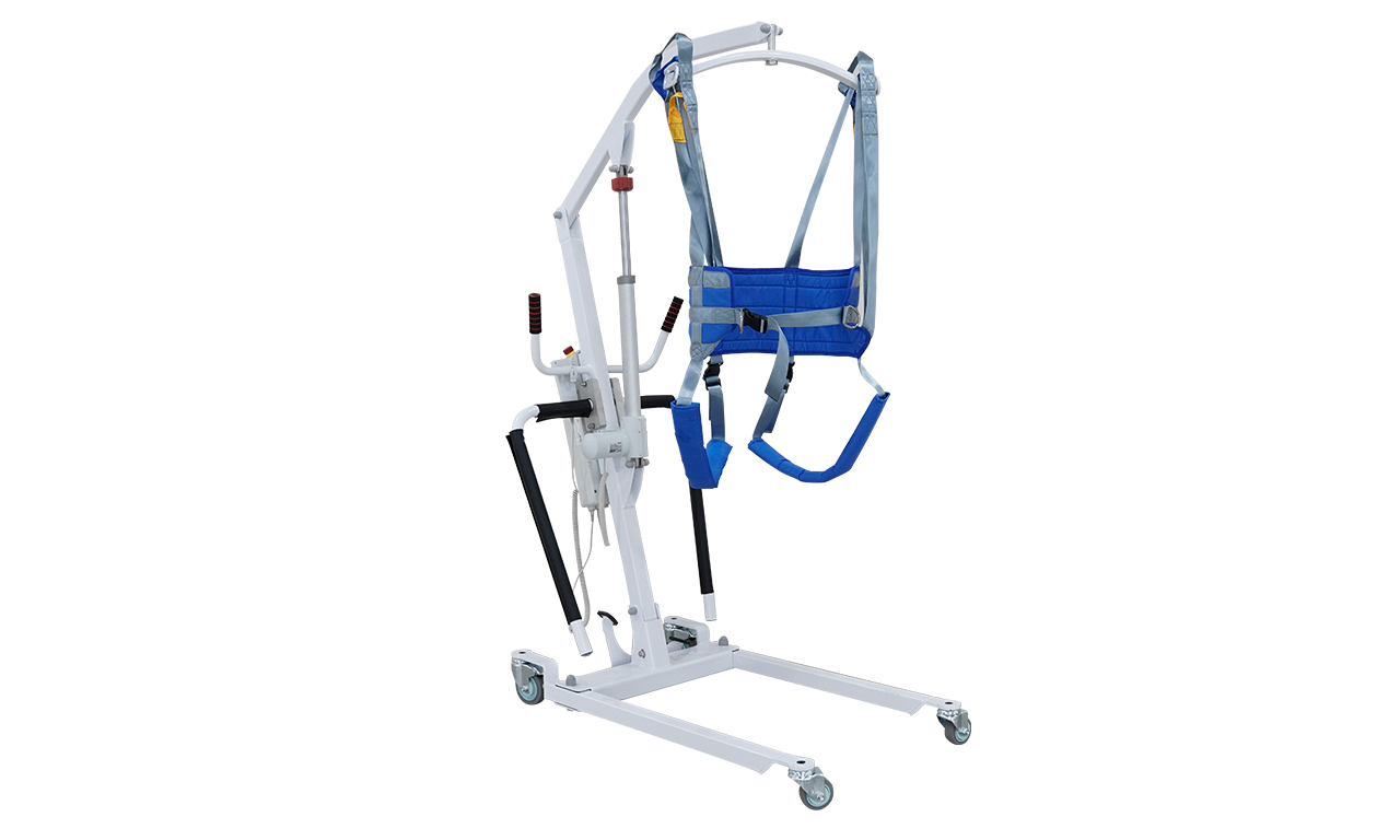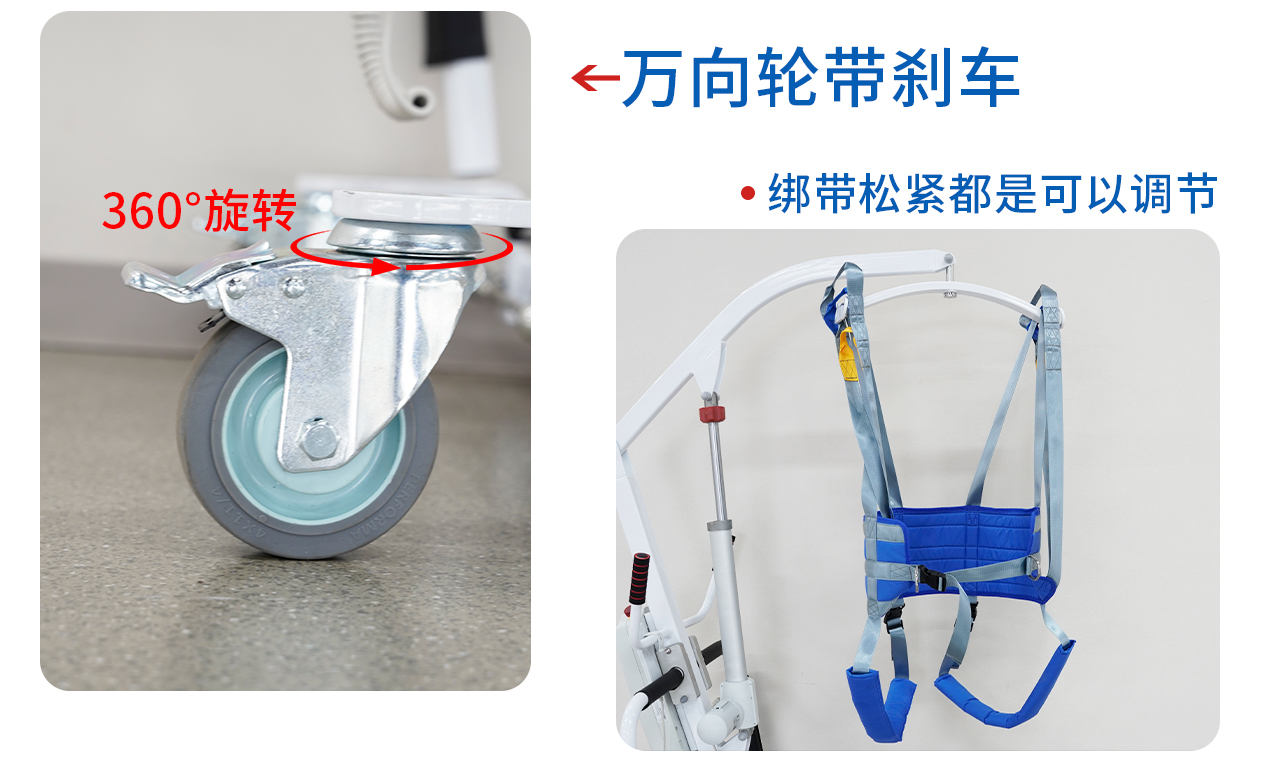 1. Thickened steel frame, electric lifting device, can be lowered manually when power is off; 2. The universal caster tube can be opened and closed to improve stability and allow access to smaller spaces; 3. Equipped with rotatable directional armrests with leather covers and foam covers; used for patient rehabilitation training; 4. A variety of slings are available to meet the daily training, movement and bathing of patients of different levels; 5. Equipped with high-thrust electric push rod; with battery;