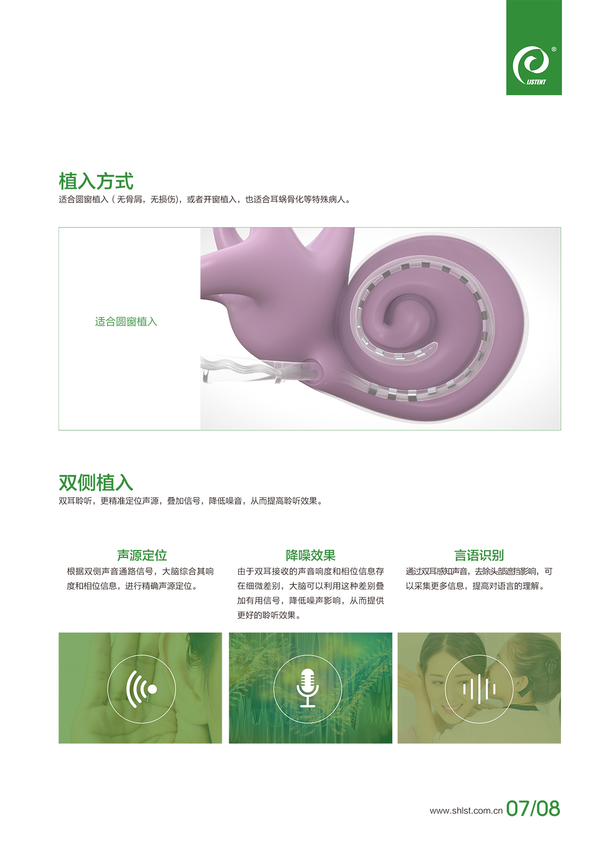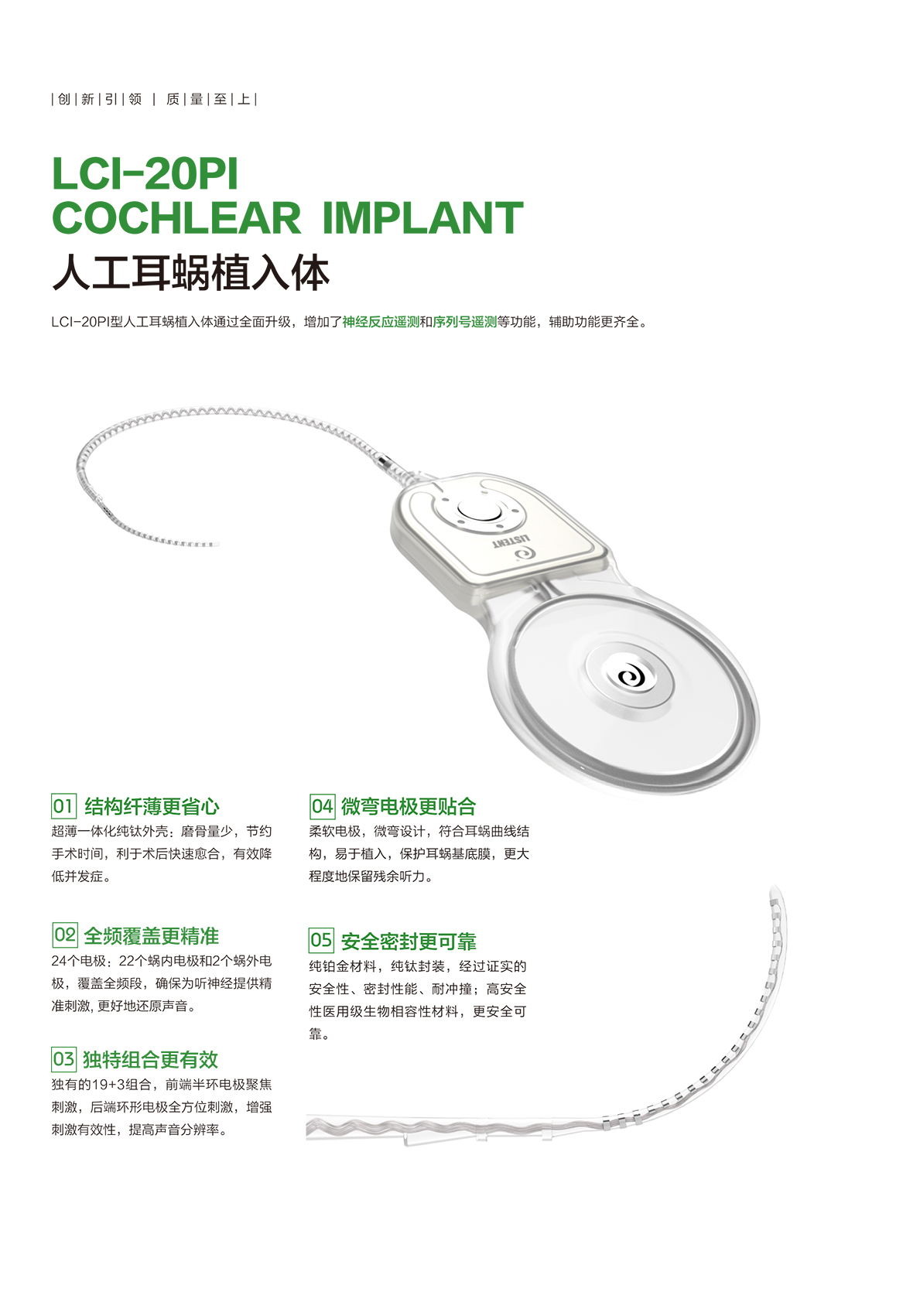 超薄一體純鈦外殼,磨骨量少,利于術后快速愈合,有效降低并發(fā)癥。 24個電極:22個蝸內電極和2個蝸外電極,覆蓋全頻段,確保為聽神經提供精準刺激, 更好地還原聲音。 獨有的19+3組合,前端半環(huán)電極聚焦刺激,后端環(huán)形電極全方位刺激,增強刺激有效性,提高聲音分辨率。 柔軟電極,微彎設計,符合耳蝸曲線結構,易于植入,保護耳蝸基底膜,更大程度地保留殘余聽力。