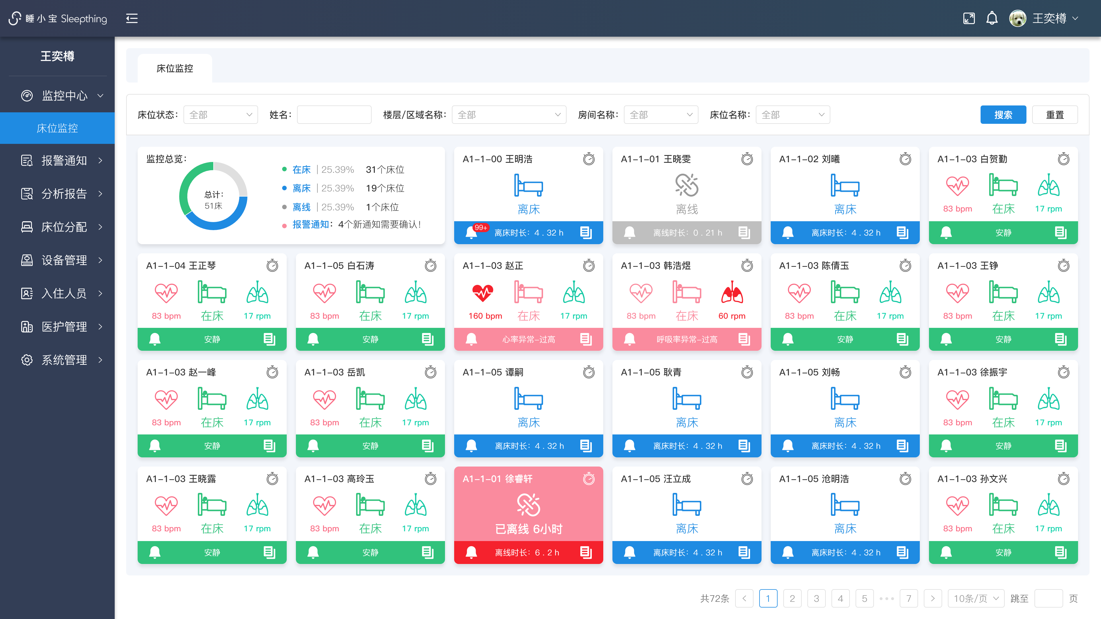 智慧養(yǎng)老監(jiān)護(hù)系統(tǒng),是由蘇州醫(yī)電園生物科技有限公司為養(yǎng)老機(jī)構(gòu)、社區(qū)、服務(wù)商實(shí)現(xiàn)集中管理、實(shí)時(shí)監(jiān)護(hù)、實(shí)時(shí)預(yù)警等功能而開(kāi)發(fā)的智能遠(yuǎn)程睡眠健康監(jiān)測(cè)系統(tǒng)。 配合睡小寶智能睡眠監(jiān)護(hù)儀使用,可以智能識(shí)別老人在/離床動(dòng)態(tài),實(shí)施監(jiān)護(hù)心率、呼吸率、體動(dòng)等體征數(shù)據(jù);支持自定義預(yù)警設(shè)置,記錄可追溯;自動(dòng)生成睡眠報(bào)告和生理健康報(bào)告;支持?jǐn)?shù)據(jù)實(shí)時(shí)云端處理,遠(yuǎn)程查看等。