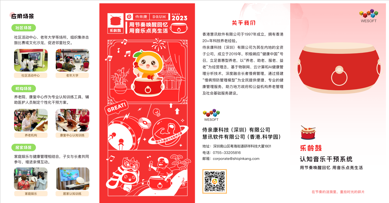 樂齡鼓基于音樂療法,深度融合中國傳統(tǒng)鼓文化與智能科技,專為長者設(shè)計。以“節(jié)奏訓練一記憶喚醒一社交激勵”三位一體化干預理念,通過沉浸式互動場景構(gòu)建,將傳統(tǒng)鼓樂藝術(shù)與現(xiàn)代認知干預技術(shù)深度融合,打造兼具文化底蘊與科技溫度的長者專屬訓練模式。長者在敲擊鼓面的過程中,既能感受節(jié)奏韻律的傳統(tǒng)魅力,又能通過智能系統(tǒng)的實時反饋,幫助長者在趣味訓練中,有效刺激大腦神經(jīng)回路、提升認知功能,增強肢體協(xié)調(diào)能力,為預防認知