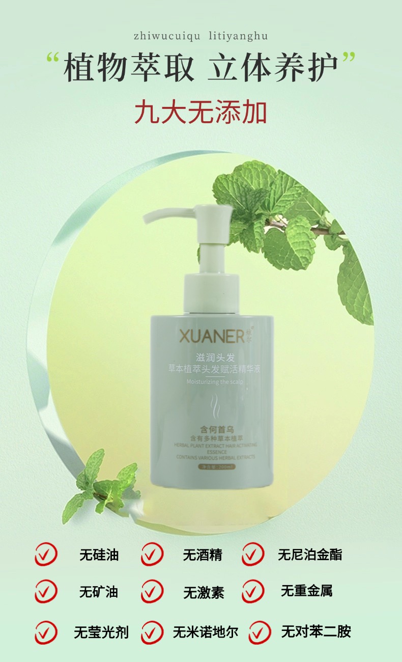 以側(cè)柏葉和何首烏為君藥,無患子、蛇床子等12味中草藥為臣藥,通過超聲提取、樹脂富集、真空濃縮等技術(shù)手段首創(chuàng)了“植物養(yǎng)發(fā)組合提取物”,應(yīng)用于烏發(fā)、生發(fā)制劑,效果明顯,無任何副作用,已經(jīng)在國家藥監(jiān)局備案,取得了純植物烏發(fā)國內(nèi)唯一組合“報送碼”,目前,已經(jīng)使用該原料生產(chǎn)出“植萃頭發(fā)賦活精華液”供應(yīng)市場。