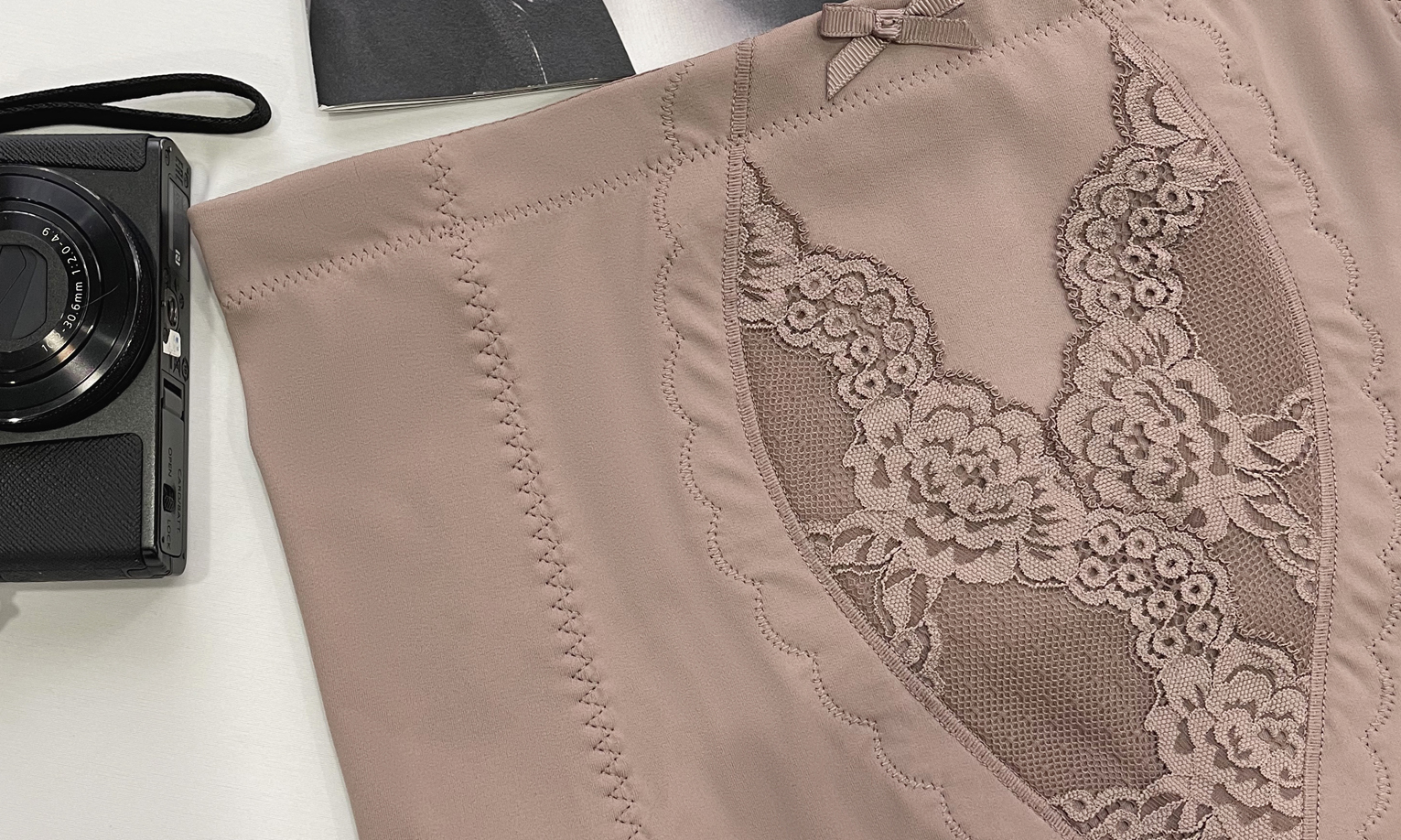 女士高腰輕塑腹三角褲前中花邊拼接錦泳,錦泳透氣手感舒適。底襠里襯100%棉,有輕微收腹效果和修飾身形。