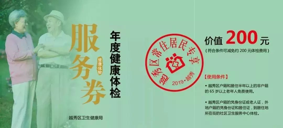 ★ 越秀區(qū)戶籍和居住半年以上的非戶籍65歲及以上的老年人,憑身份證/老人證或者居住證到居住地所在的街道退管所、居委會、社區(qū)衛(wèi)生服務中心即可領取價值200元免費年度健康體檢服務劵。