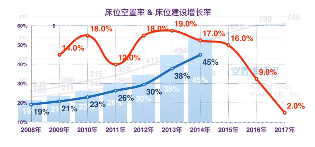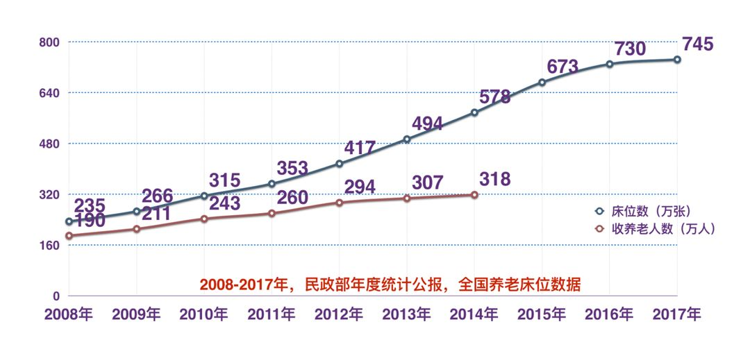 根據(jù)民政部年度統(tǒng)計(jì)公報(bào),在過去的 10 年間,全國養(yǎng)老床位數(shù)量持續(xù)增長,截止 2017 年末,已達(dá)到 745 萬張。