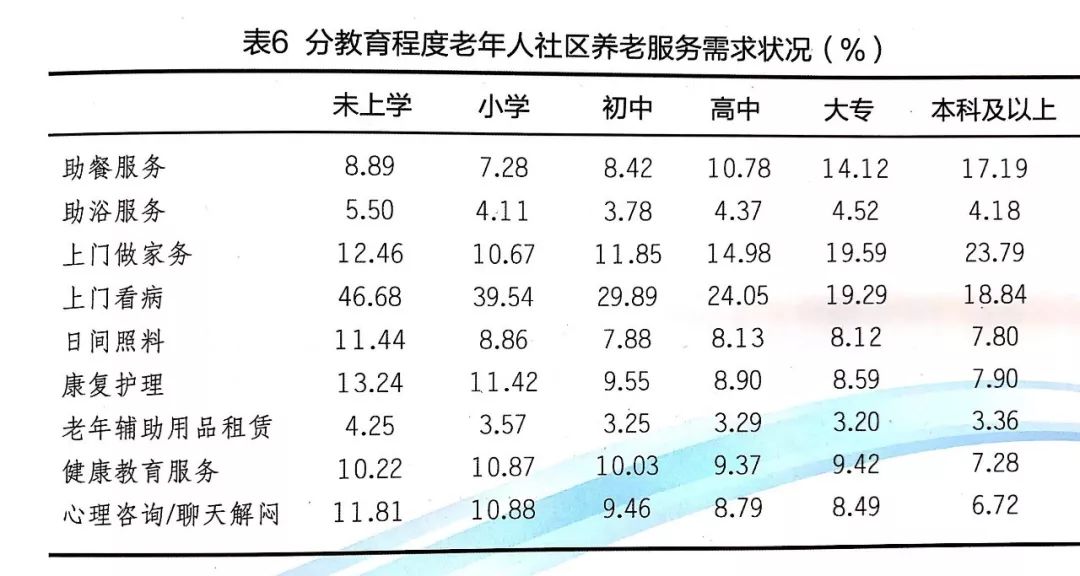 從受教育程度來看,老年人對助餐服務(wù)和上門做家務(wù)的需求是隨著受教育程度升高而增加。相反,對上門看病、日間照料、康復(fù)護理與心理咨詢/聊天解悶的需求是隨著教育程度升高而降低。由表6可見,學(xué)歷低的老年人對健康和康復(fù)護理的需求較大,學(xué)歷高的老年人則對助餐、上門做家務(wù)的需求較大。