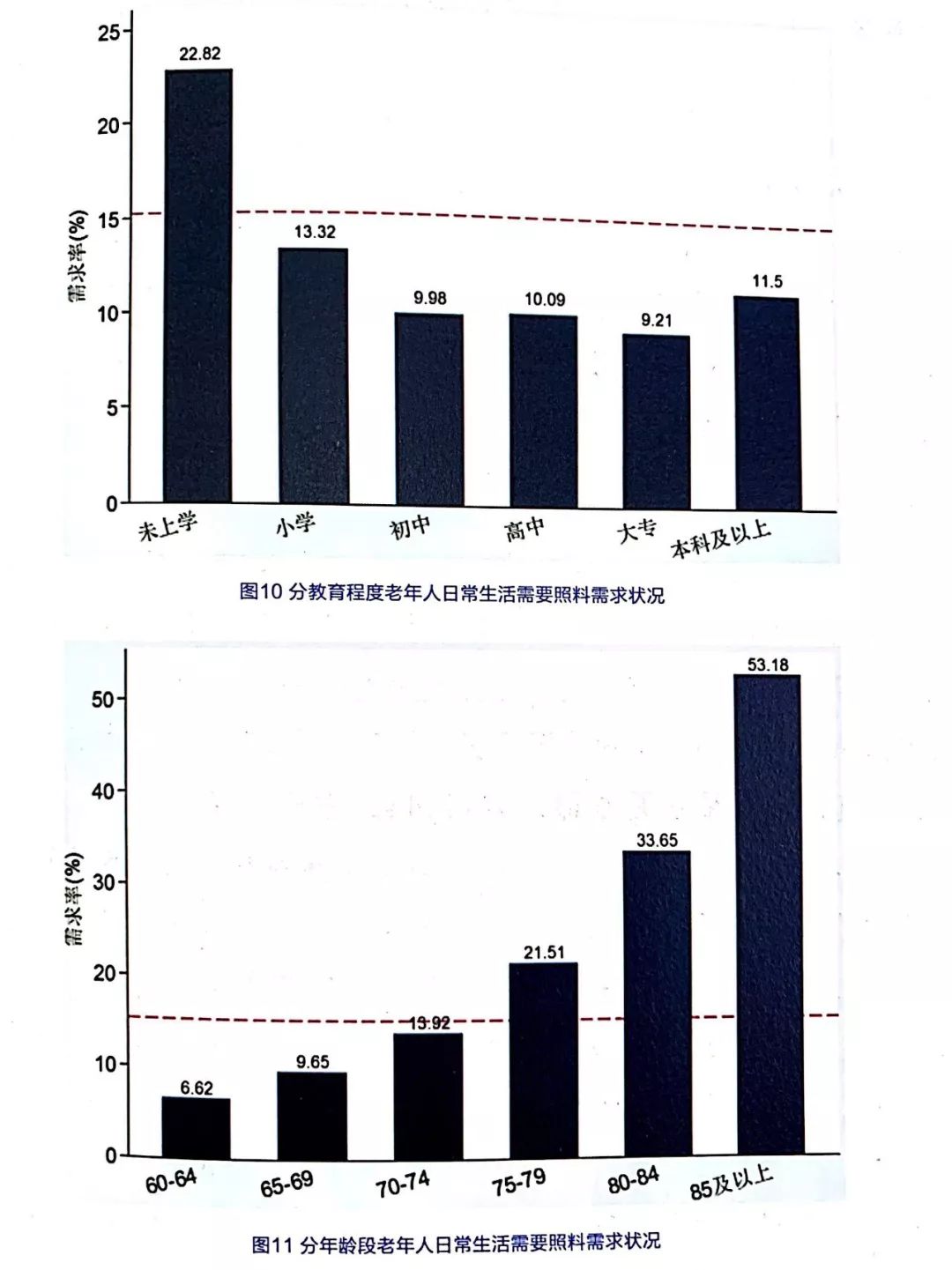 從婚煙狀況來看,喪偶或離婚的老年人日常生活照料需求率最高,為25.01%,未婚的老年人和有配偶的老年人分別為19.32%和11.54%。