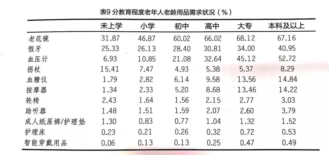 小結(jié):從總體來看,我國老年人對老齡用品的需求率較低,除了老花鏡、假牙、血壓計和拐杖,其他老齡用品的需求率均低于4%,其中城市老年人的需求意愿普遍高于農(nóng)村老年人。年齡與受教育程度是影響老年人對老齡用品需求的重要變量,性別影響較小,年齡增長和受教育程度提高會導(dǎo)致需求増加。完全失能、貧困老年人對拐杖、輪椅、成人紙尿褲/護理墊的需求較大,未婚老年人整體需求意愿不強。