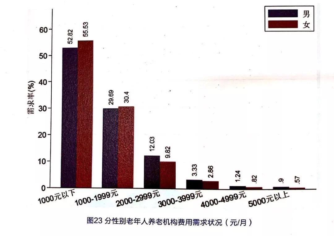從不同性別來看,男性老年人和女性老年人對養(yǎng)老服務(wù)機構(gòu)費用的需求率基本相同。養(yǎng)老服務(wù)機構(gòu)費用在2000元以下/月時,女性需求率略高于男性;在2000元/月以上時,男性需求率略高于女性,見圖23。