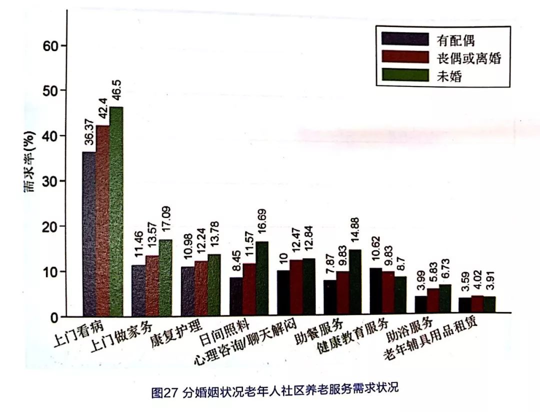 從婚姻狀況來看,未婚老年人相比其他婚姻狀況老年人,對社區(qū)養(yǎng)老服務(wù)需求較大,其中,對上門看病、上門做家務(wù)、日間照料需求居于前三位;有配偶老年人與喪偶或離婚老年人對社區(qū)養(yǎng)老需求差別不大,見圖27。