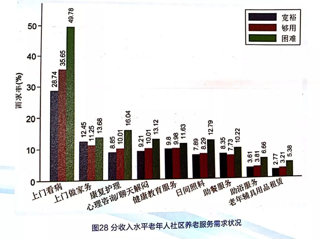 從收入水平來看,困難的老年人相比收入寬裕和夠用的老年人,對社區(qū)養(yǎng)老服務(wù)需求較大,除助浴服務(wù)、老年輔助用品租賃外,其他服務(wù)需求率均超過10%,特別是對上門看病服務(wù)的需求率為49.78%,其次是康復(fù)護理,需求率為16.04%,見圖28。
