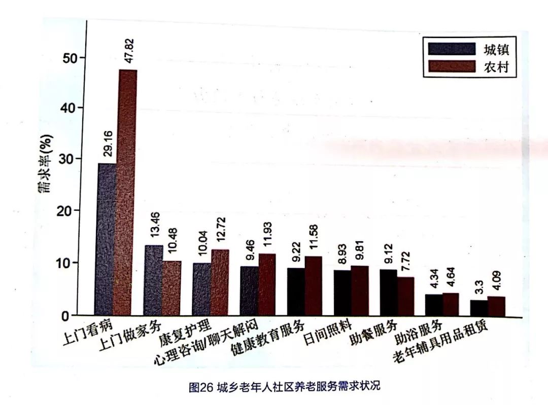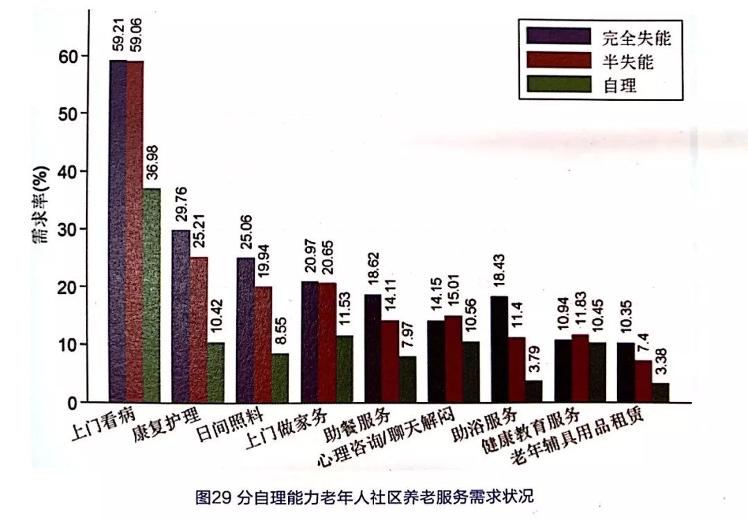 小結(jié):目前,上門看病是老年人社區(qū)養(yǎng)老服務(wù)的主要需求,特別是農(nóng)村老年人、生活困難老年人、完全失能老年人。完全失能、半失能的老年人是社區(qū)養(yǎng)老服務(wù)的主要需求對象。