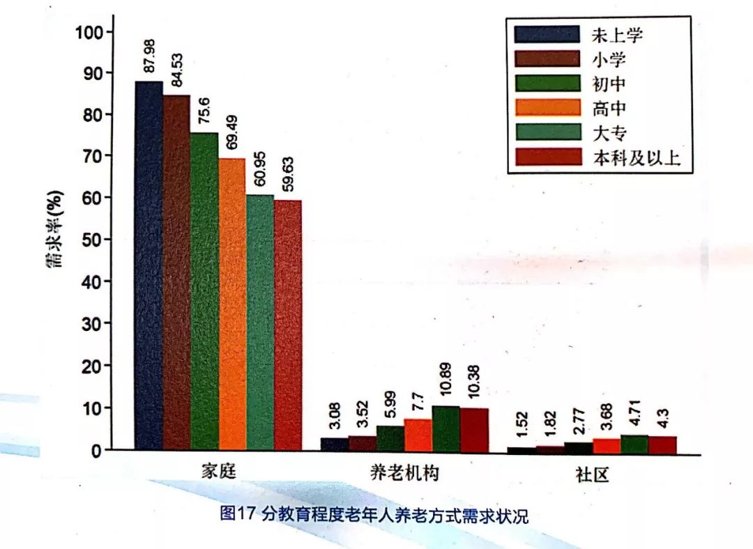 從受教育程度來看,老年人對家庭養(yǎng)老的需求意愿隨著受教育程度提高而減弱。在家庭養(yǎng)老的需求意愿方面,未上學(xué)的老年人需求率最高,為87.98%;本科及以上的老年人需求率最低,為59.63%,見圖17。另外,老年人對養(yǎng)老機構(gòu)和社區(qū)養(yǎng)老的需求意愿隨著受教育程度提高而增強。
