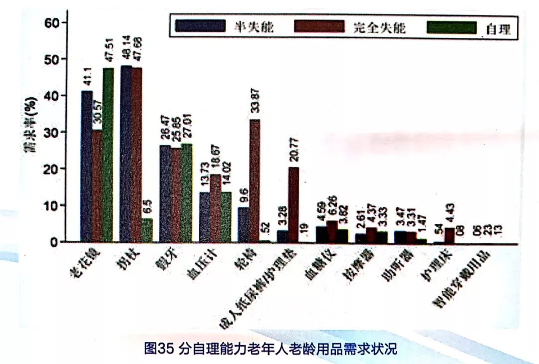 《我國老齡產(chǎn)業(yè)發(fā)展報告(2014)》將老齡用品分為老年日用品、老年服飾用品、老年保健用品、老年照顧與護理輔具、老年行動輔具、老年溝通與信息輔具等12類,其中,最主要的老齡用品是老年照顧和護理輔具、老年行動輔具、老年溝通與信息輔具等日常生活輔助用品。