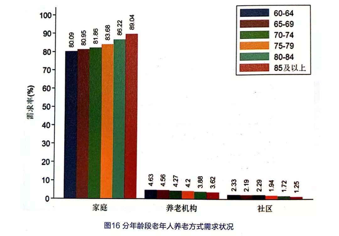 從不同年齡段來看,老年人對家庭養(yǎng)老的需求意愿是隨著年齡增長而逐漸增強。相反,對養(yǎng)老機構(gòu)與社區(qū)養(yǎng)老的需求意愿是隨著年齡增長反而逐漸減弱,見圖16。