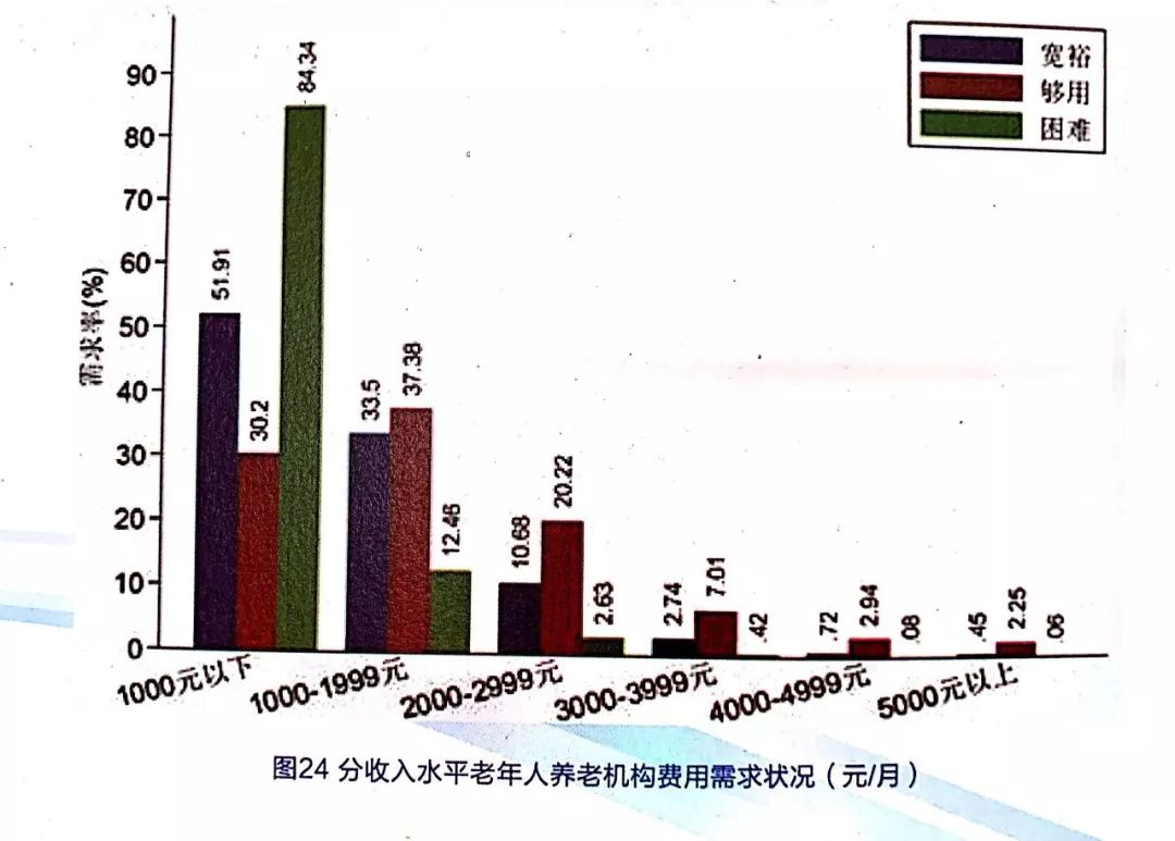 從收入水平來看,養(yǎng)老服務(wù)機構(gòu)費用在2000元/月和1000元/月以下時,困難老年人的需求率分別為96.80%和84.34%,見圖24??傮w來看,在費用2000元/月以上時,收入夠用的老年人可以承受的比例更高,反映出收入較好的老年人可以承受的養(yǎng)老服務(wù)機構(gòu)費用也相對較高。