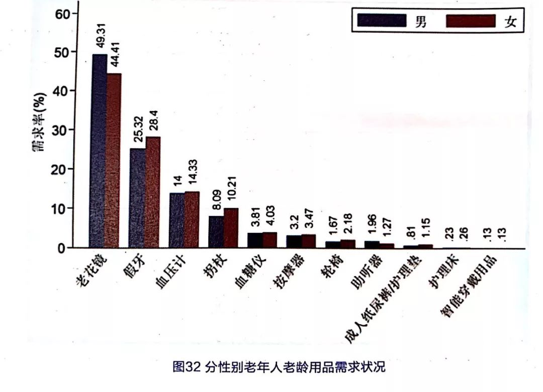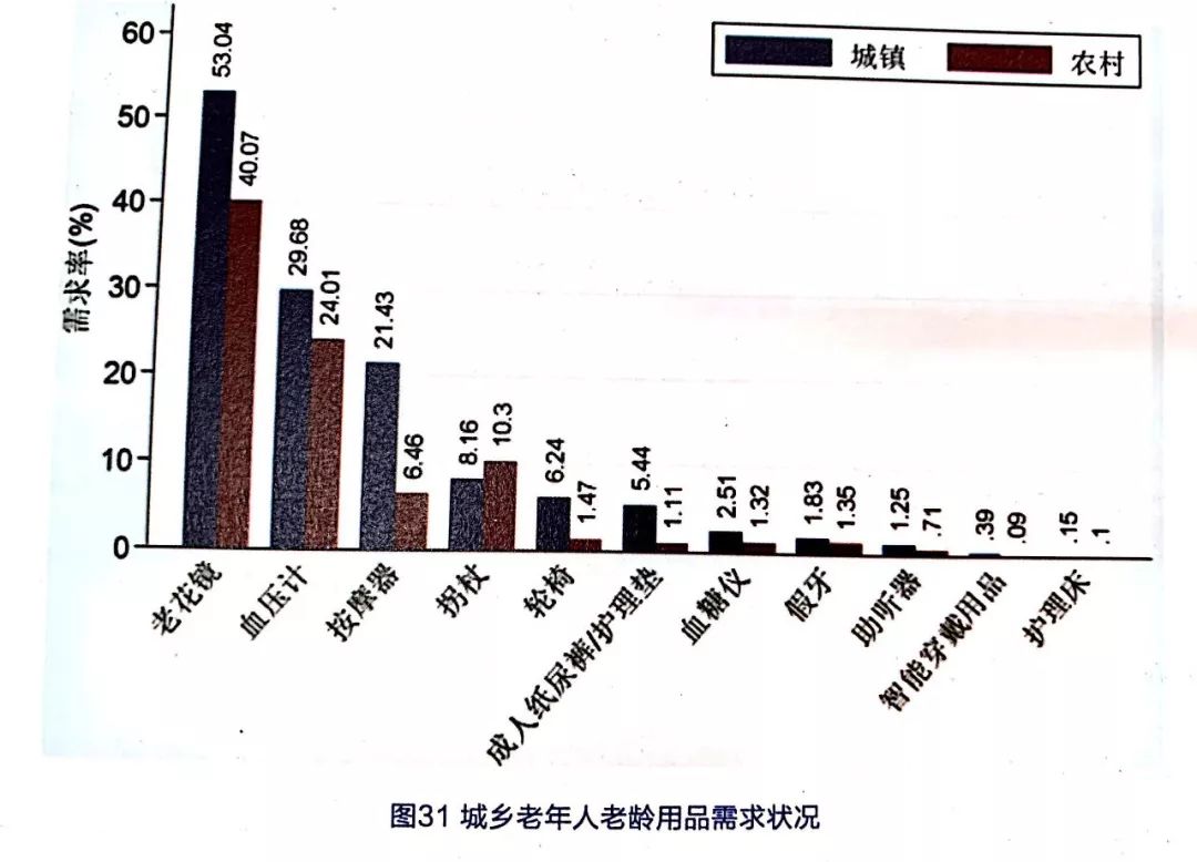 從圖31可以看出,除拐杖外,城市老年人對各種老齡用品的需求均高于農(nóng)村老年人,特別是按摩器、輪椅與成人紙尿褲/護理墊,分別為3.32倍、4.24倍和4.9倍,但農(nóng)村老年人對于拐杖的需求高于城市老年人。由此可見,農(nóng)村老年人對老齡用品的需求意愿普遍不強,行動不便的老年人多選擇依靠拐杖出行。