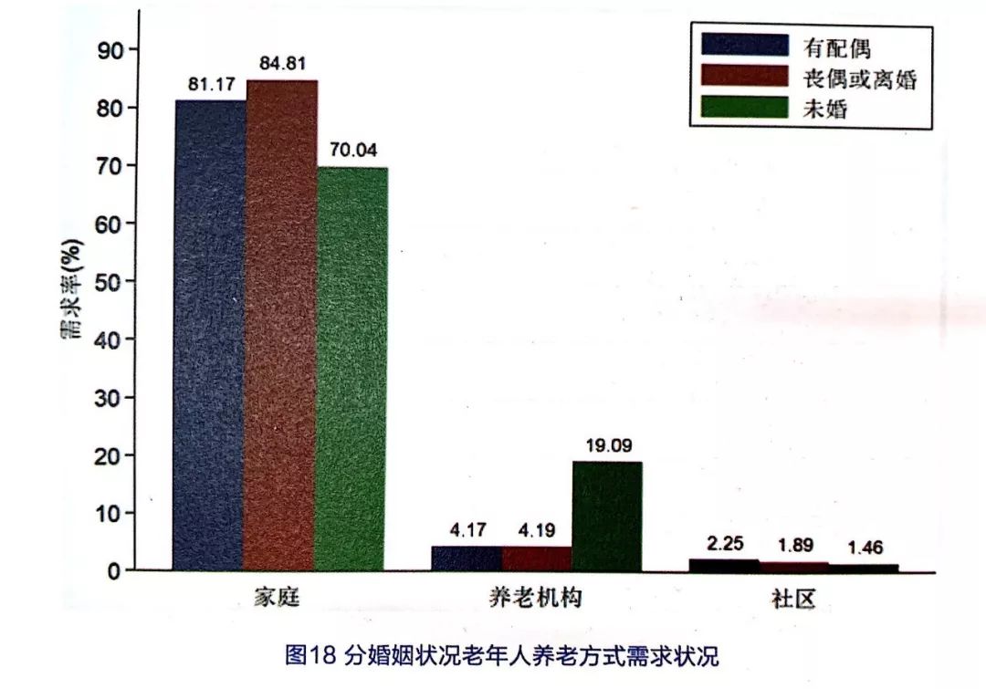 從婚姻狀況來看,喪偶或離婚老年人對家庭養(yǎng)老的需求意愿最強,未婚老年人對家庭養(yǎng)老的需求意愿最低,兩者的需求率相差14.77%。未婚老年人對機構(gòu)養(yǎng)老的需求意愿最強,為19.09%,見圖18。