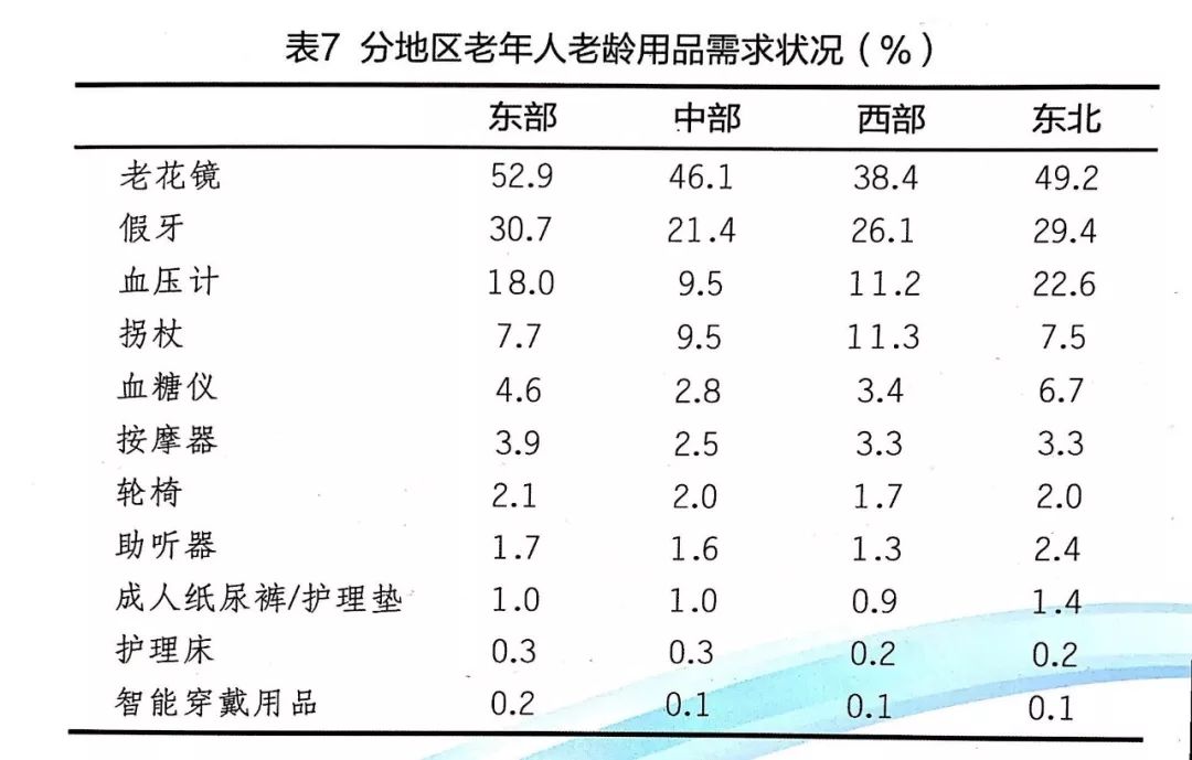 從不同地區(qū)來看,老花鏡、假牙和血壓計是老年人需求量較大的老齡用品。在老花鏡、假牙、按摩器、輪椅、護理床、智能穿戴用品等方面,東部地區(qū)老年人的需求比例明顯高于其他地區(qū),分別為52.9%、30.7%、3.9%、2.1%、0.3和0.2%;在老花鏡、血壓計、血糖儀、助聽器和成人紙尿褲等方面,東北地區(qū)老年人的需求比例明顯高于其他地區(qū),分別為49.2%、22.6%、6.7%、2.4%和1.4%;在拐杖方面,西部地區(qū)老年人的需求比例最高,為11.3%,見表7。