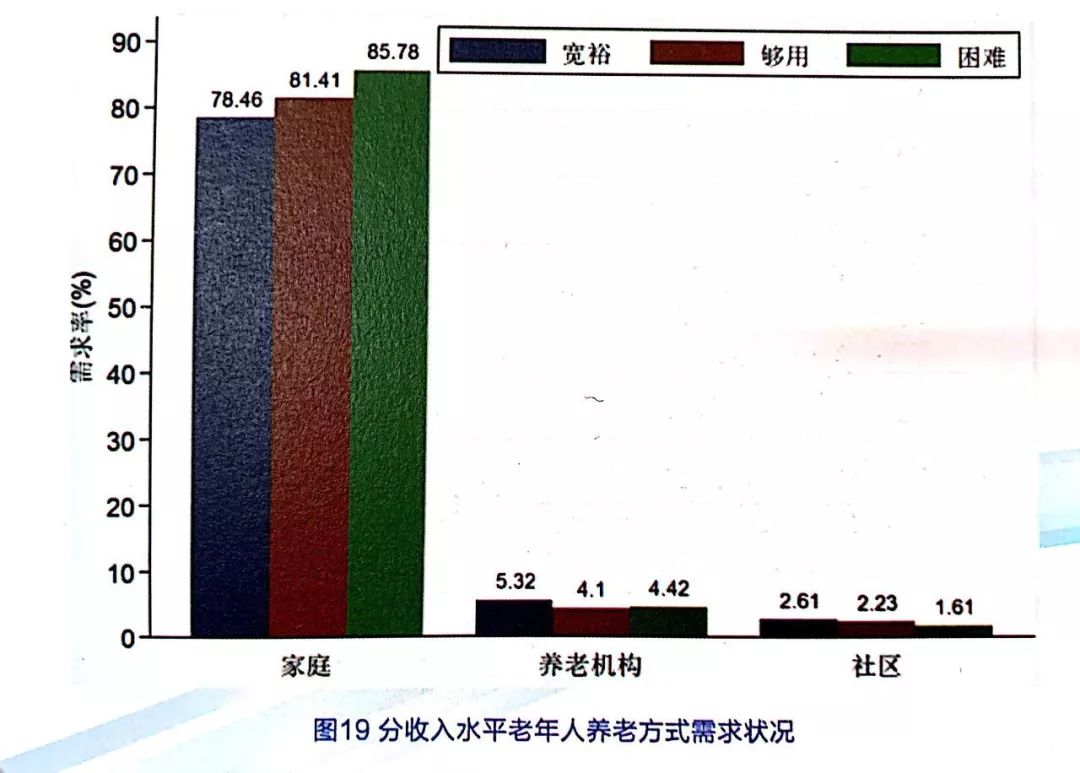 從收入水平來看,收入寬裕、夠用和困難的老年人對家庭養(yǎng)老需求意愿均較高,需求率分別為78.46% 、81.41%和85.78%;社區(qū)養(yǎng)老需求意愿均較低,需求率分別為2.61%、2.23%和1.61%;收入夠用老年人對機構(gòu)養(yǎng)老的需求意愿最低,見圖19。