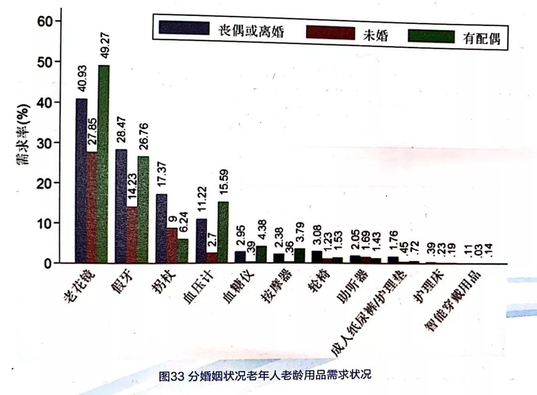 從婚姻狀況來看,有配偶的老年人對老花鏡、血壓計、血糖儀和按摩器的需求高于其他老年人;喪偶或離婚的老年人對拐杖、輪椅、成人紙尿褲/護理墊的需求高于其他老年人,反映出身體健康狀況相對較差;未婚的老年人對各項老齡用品的需求均低于其他老年人,見圖33。