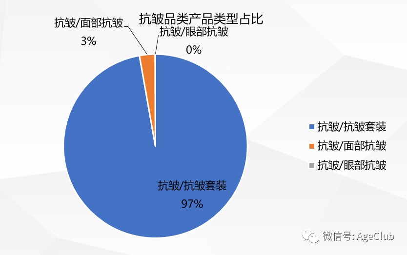 抗皺品類的產品類型以抗皺套裝為主,一般是面部、眼部各種功效產品打包在一起的套裝,這可能說明目前消費化妝品的中老年女性對品牌、功效的認識較淺,套裝可以免去選擇、搭配的困擾,因此更受她們歡迎。