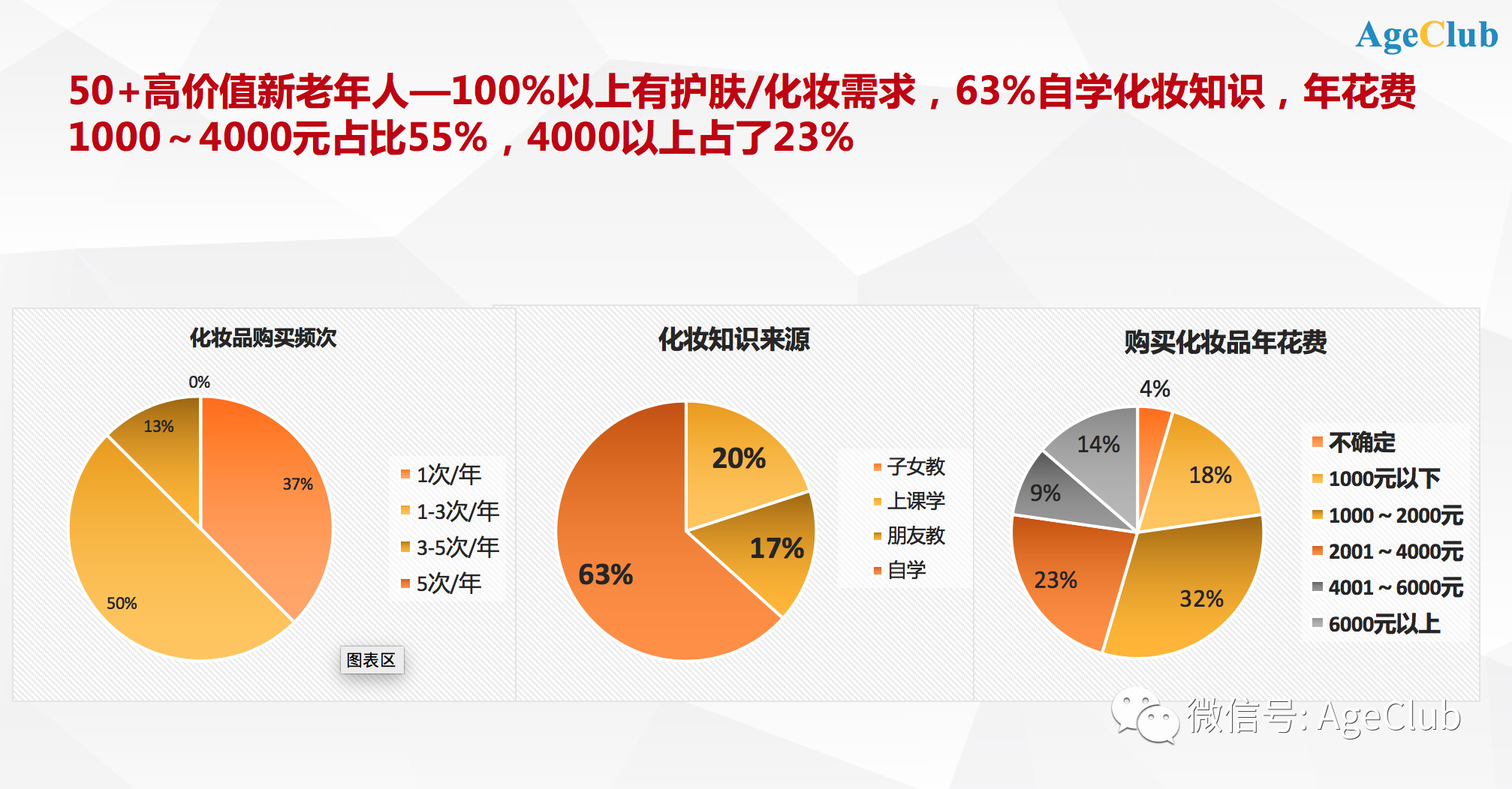 上個月,AgeClub在北京找了100位50-70歲之間的活力新老年人,對這些高價值新老年人的生活消費方式進行了深度調研,在調研中發(fā)現,北京50+中老年人群100%都會護膚化妝,其中年均購買化妝品1~3次的中老年占比50%,3次以上占13%,從我們調研結果來看,市場需求潛力巨大。