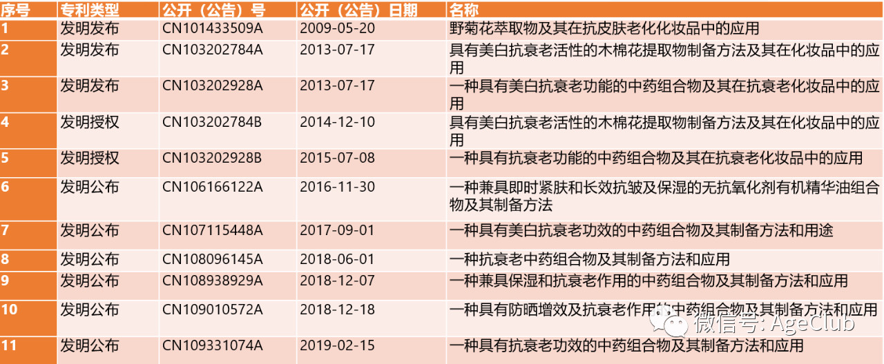 其實以美膚寶的專利技術實力,在中老年化妝品市場或許還將有更大的發(fā)展空間。查詢美膚寶的專利信息,發(fā)現其在中老年抗皺抗衰老方面已有不少積累,2009年至今,共有11項發(fā)明專利。