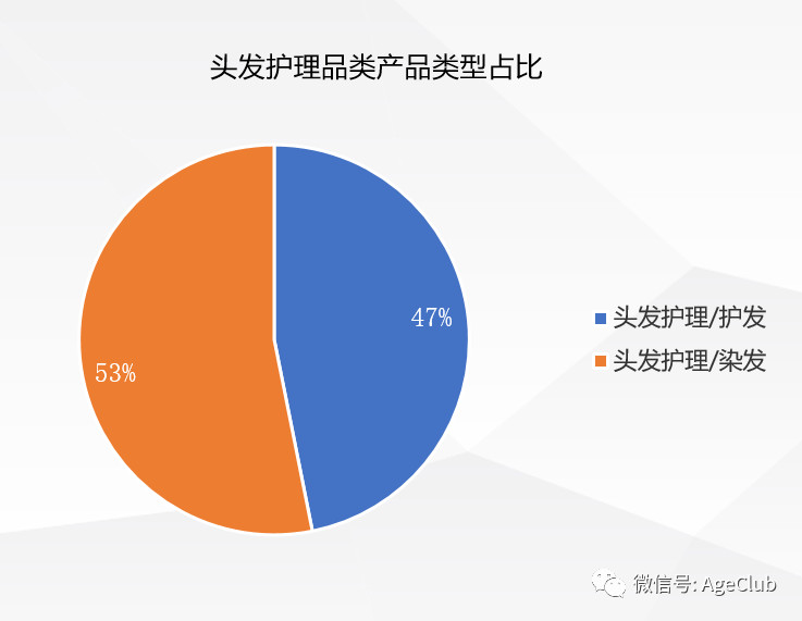 中老年化妝品另一個大品類頭發(fā)護理,專門解決中老年常見的白發(fā)問題。從白發(fā)變黑的功能性從弱到強劃分,主要分為5種產品類型:精華液、洗發(fā)水(護發(fā)型)、洗發(fā)水(染發(fā)型)、養(yǎng)發(fā)粉、染發(fā)劑。其中護發(fā)型產品的銷售額占比為47%,染發(fā)型產品的銷售額占比為53%。