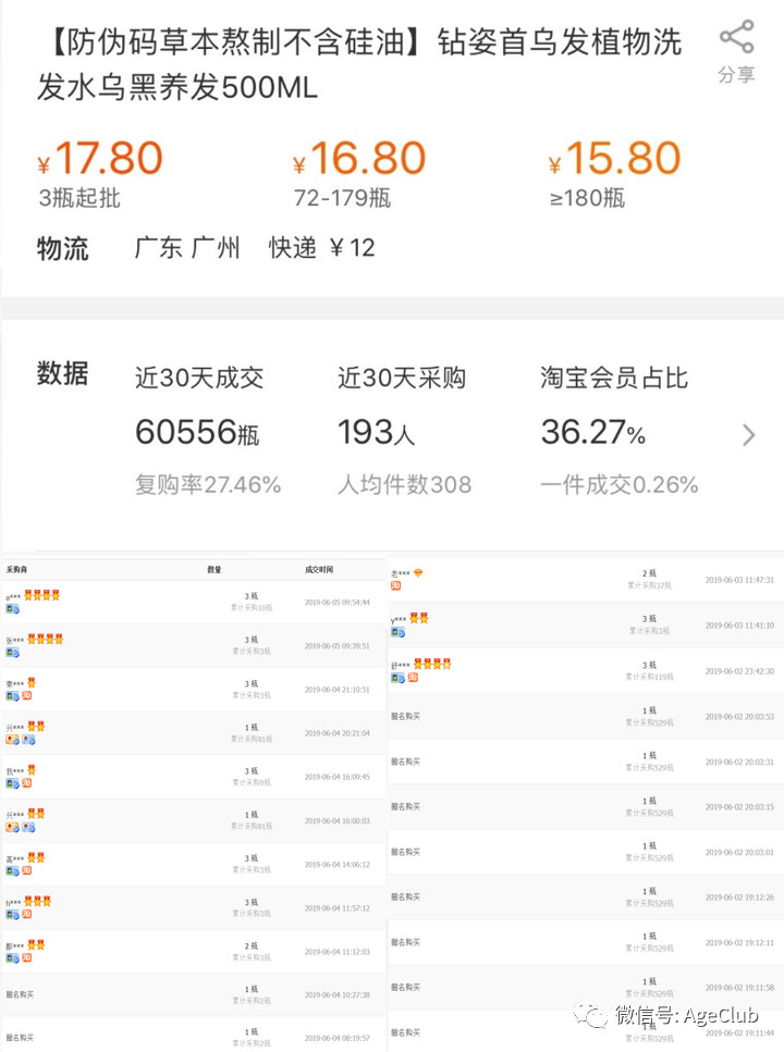 鉆姿是頭發(fā)護理品類里市場份額最高的品牌,達到38%。從鉆姿洗發(fā)水在1688.com的銷售情況和成交記錄來看,單瓶價格最低15.8元,與淘寶主力價格段68-89元有很大價差;且成交記錄中有很多是1-3瓶為單位銷售的,很可能是微商慣用的一件代發(fā)模式。