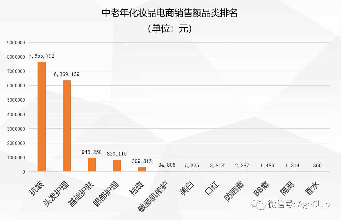 從電商數據來看,目前中老年女性的化妝品需求主要集中在功能性產品,尤其是抗皺和頭發(fā)護理兩大類。