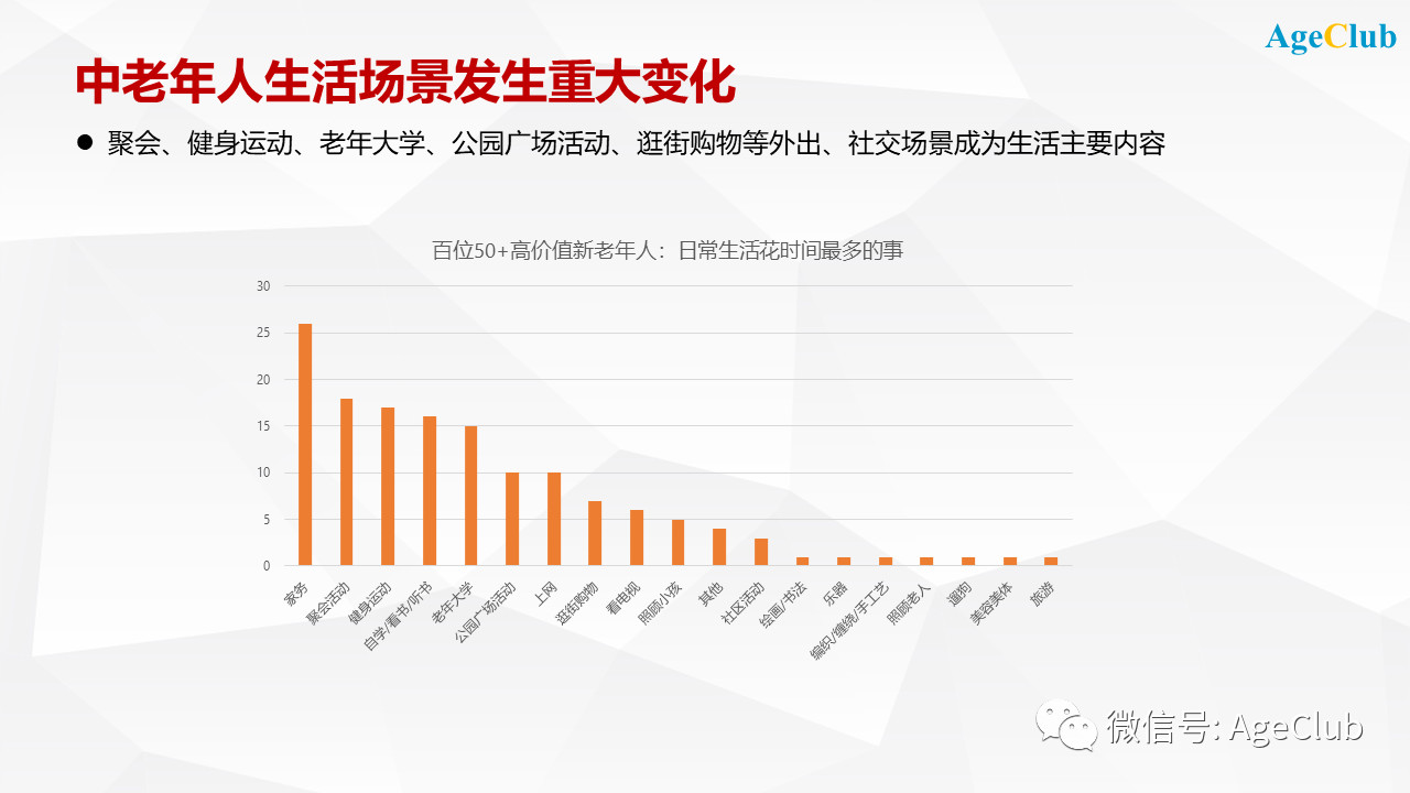 再?gòu)腁geClub近期做的北京百位50+高價(jià)值新老年人深度調(diào)研看,聚會(huì)、健身運(yùn)動(dòng)、老年大學(xué)、公園廣場(chǎng)活動(dòng)、逛街購(gòu)物等外出、社交場(chǎng)景的活動(dòng)成為生活主要內(nèi)容。這個(gè)結(jié)果其實(shí)與我們?nèi)粘I钏^察感受到的是一致的。