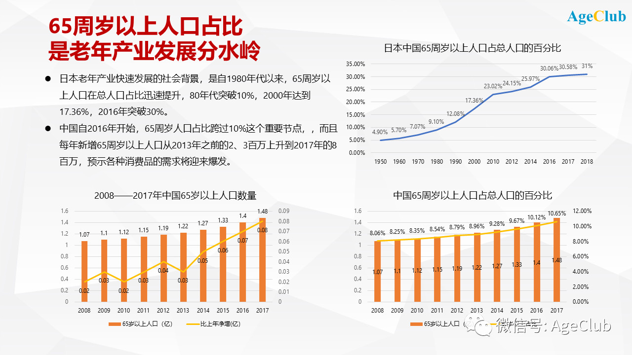 中國(guó)自2016年開(kāi)始,65周歲人口占比跨過(guò)10%這個(gè)重要節(jié)點(diǎn),而且每年新增65周歲以上人口從2013年之前的2、3百萬(wàn)上升到2017年的8百萬(wàn),預(yù)示各種消費(fèi)品的需求將迎來(lái)爆發(fā)。
