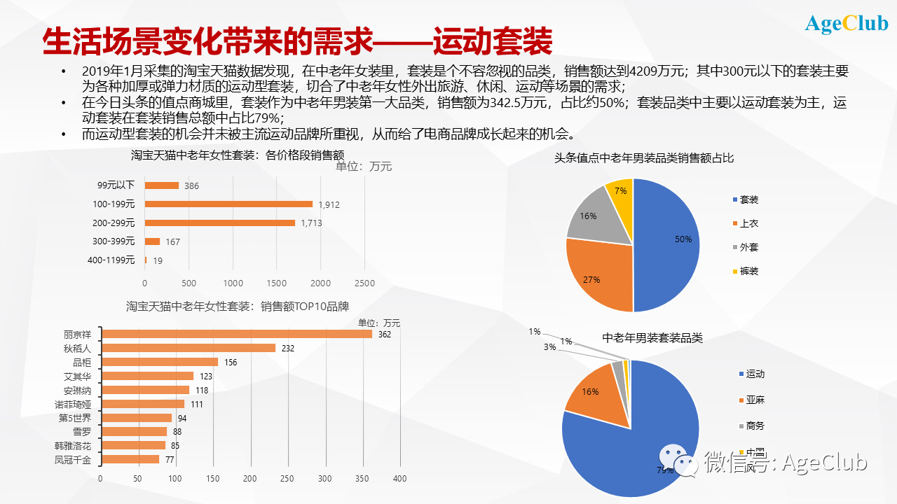 另一個(gè)行業(yè)案例是運(yùn)動(dòng)套裝。最開(kāi)始是2019年1月采集的淘寶天貓數(shù)據(jù)里面,我們發(fā)現(xiàn)在中老年女裝里,套裝是個(gè)不能忽視的品類,銷售額達(dá)到4209萬(wàn)元;