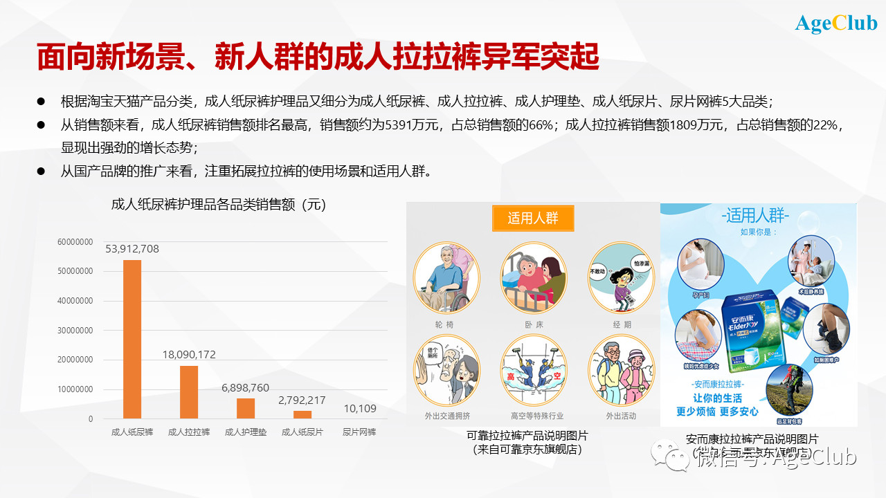 而且從主要品牌的拉拉褲產(chǎn)品說(shuō)明圖片也能看到,在很積極地拓展新的目標(biāo)客群,不再局限于原先的臥床在家的老人,而是有活動(dòng)能力、喜歡四處游玩的活力老人,和有泌尿困擾的經(jīng)期、孕期女性等。