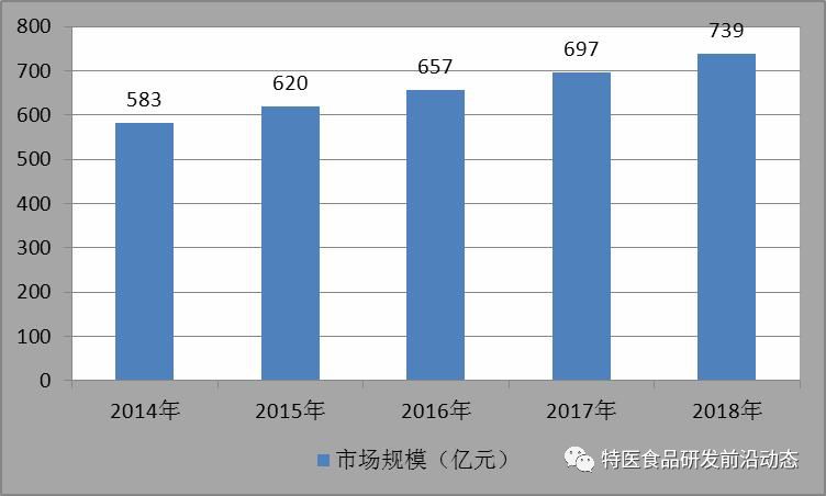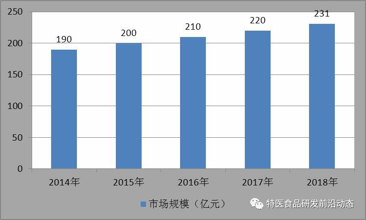 圖表1:2014-2018年特醫(yī)食品市場(chǎng)規(guī)模(單位:億元)