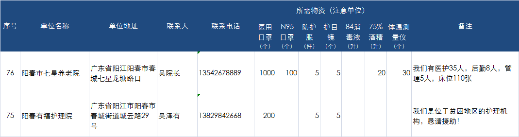 據(jù)公眾號(hào)“健康養(yǎng)老頻道(SICnews)”、“阿沐養(yǎng)老(MorHome)”、“永愛養(yǎng)老(gdong-ai)”等渠道相關(guān)消息,目前已有76家養(yǎng)老(醫(yī)養(yǎng))機(jī)構(gòu)發(fā)布防護(hù)物資需求,詳情見后。