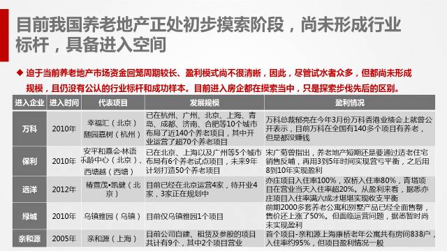 越來越多的企業(yè)瞄準養(yǎng)老地產(chǎn)市場,不完全統(tǒng)計,目前已有超過80家企業(yè)分食養(yǎng)老這一“蛋糕”。本篇奉上純干貨,養(yǎng)老地產(chǎn)的機會點?商業(yè)模式?典型案例?你想要的都在這里啦!