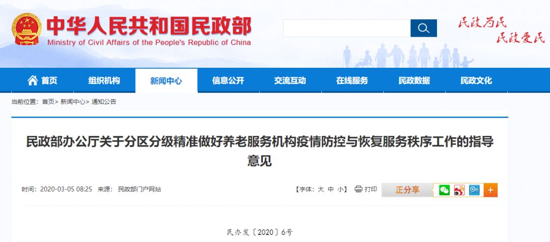 5.按照當(dāng)?shù)匾咔槁?lián)防聯(lián)控機(jī)制統(tǒng)一部署,在嚴(yán)格執(zhí)行民政部印發(fā)的《養(yǎng)老機(jī)構(gòu)新型冠狀病毒感染的肺炎疫情防控指南(第二版)》前提下,可以逐步恢復(fù)開放。