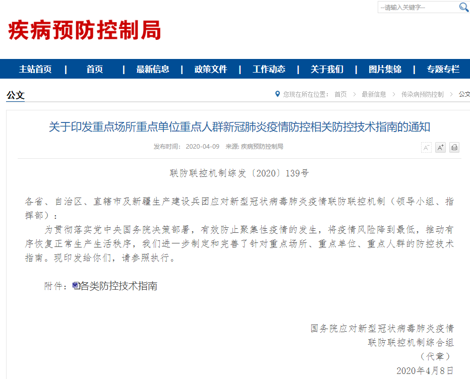 4月9日,國(guó)家衛(wèi)健委疾病預(yù)防控制局公布了《關(guān)于印發(fā)重點(diǎn)場(chǎng)所重點(diǎn)單位重點(diǎn)人群新冠肺炎疫情防控相關(guān)防控技術(shù)指南的通知》。